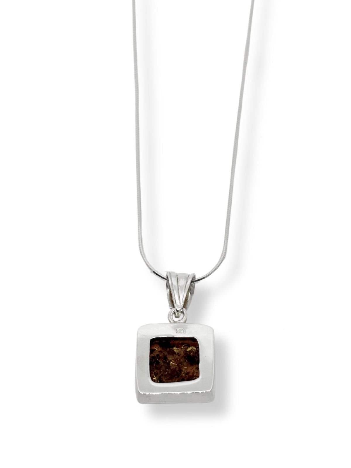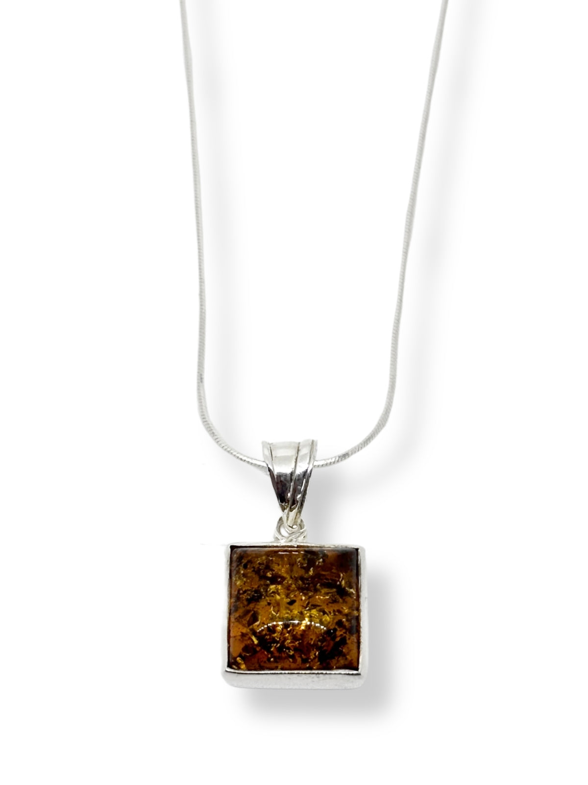 Kare Çerçeveli Kehribar Işıltısı Gümüş Kolye – Doğanın Sıcak Dokunuşu