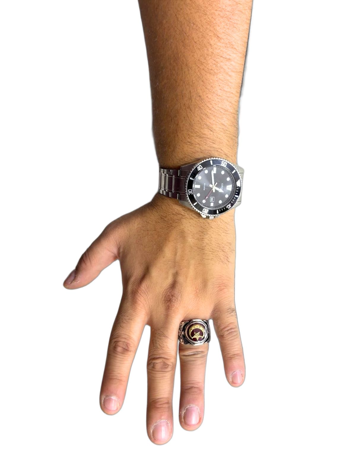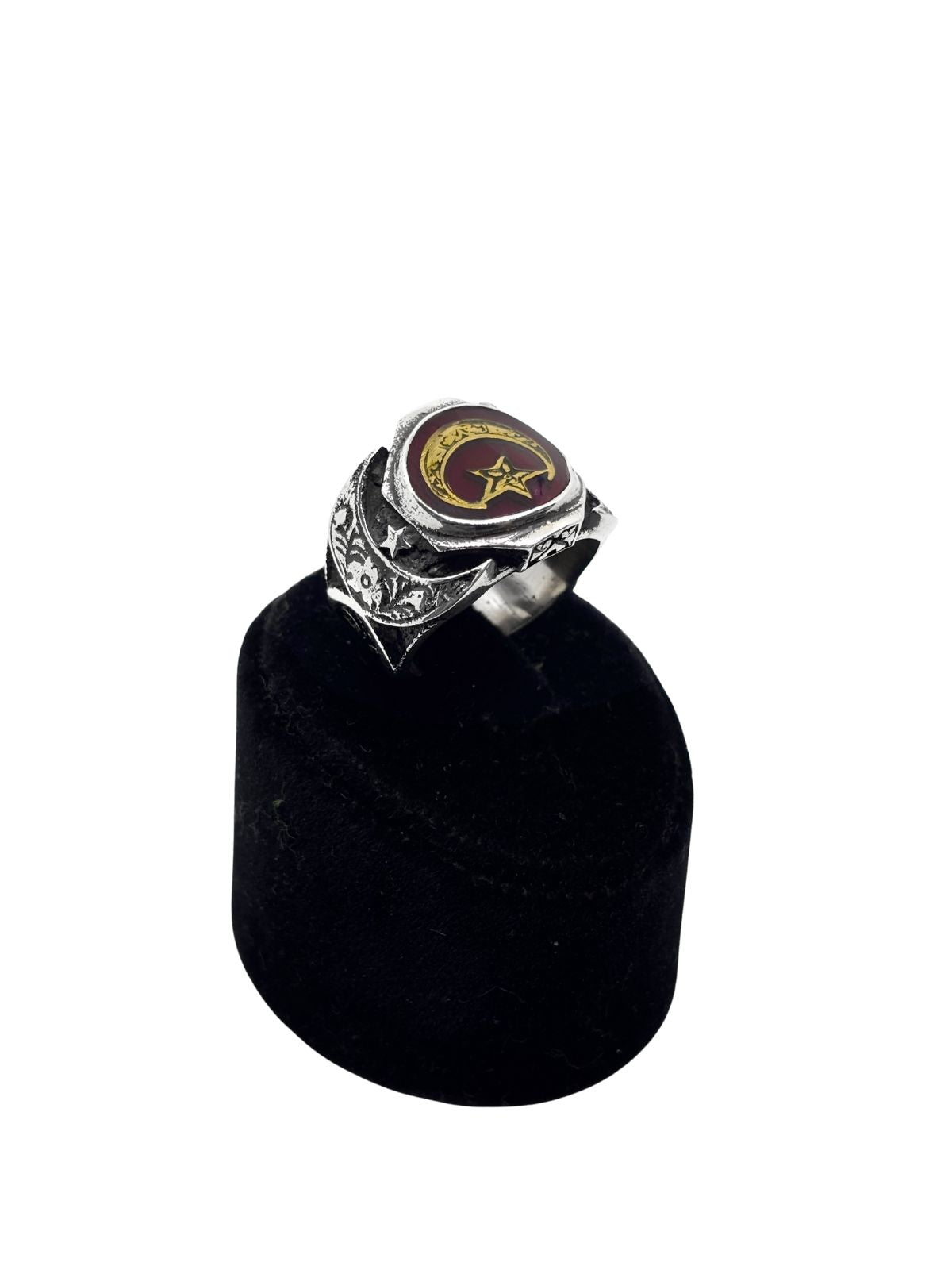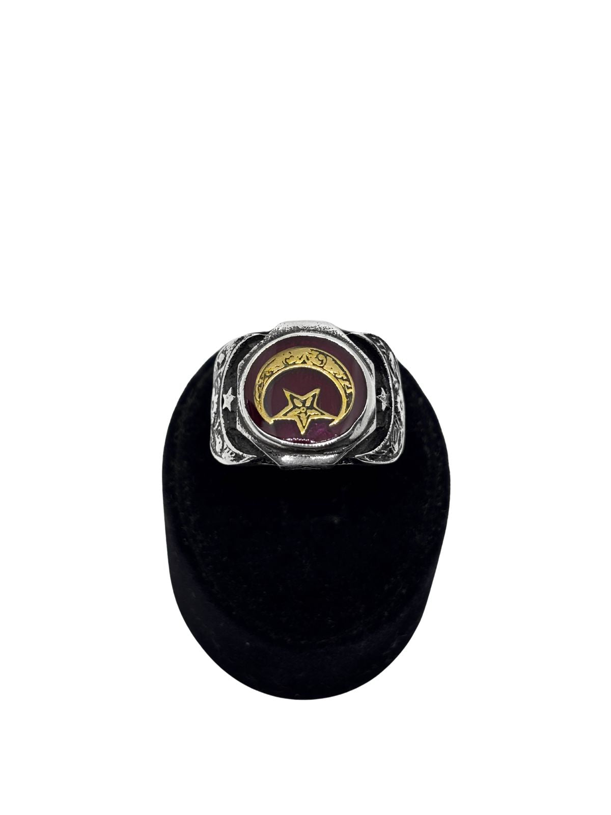 Yuvarlak Kahverengi Mineli Yaldızlı Ay Yıldız Gümüş Erkek Yüzük