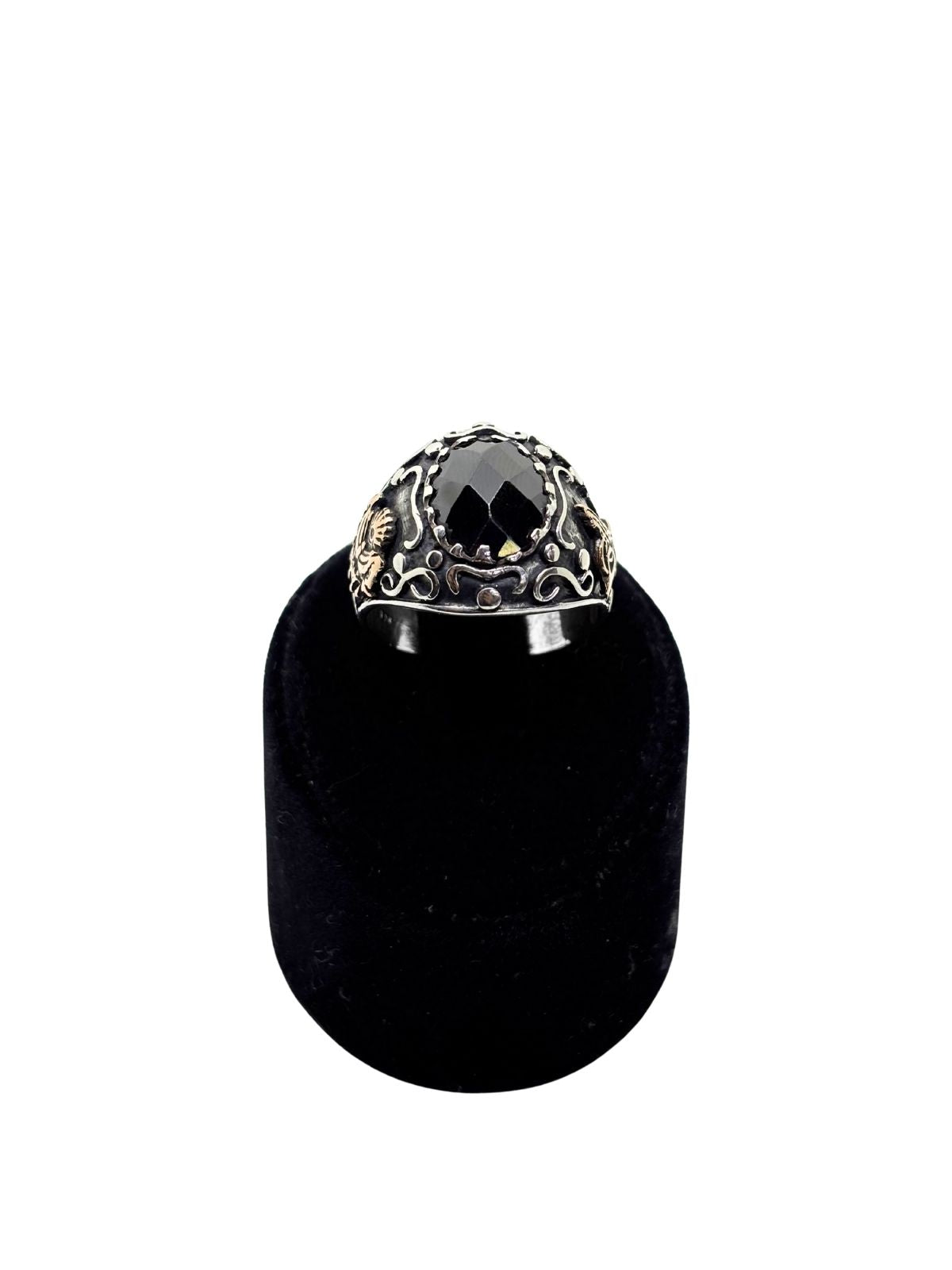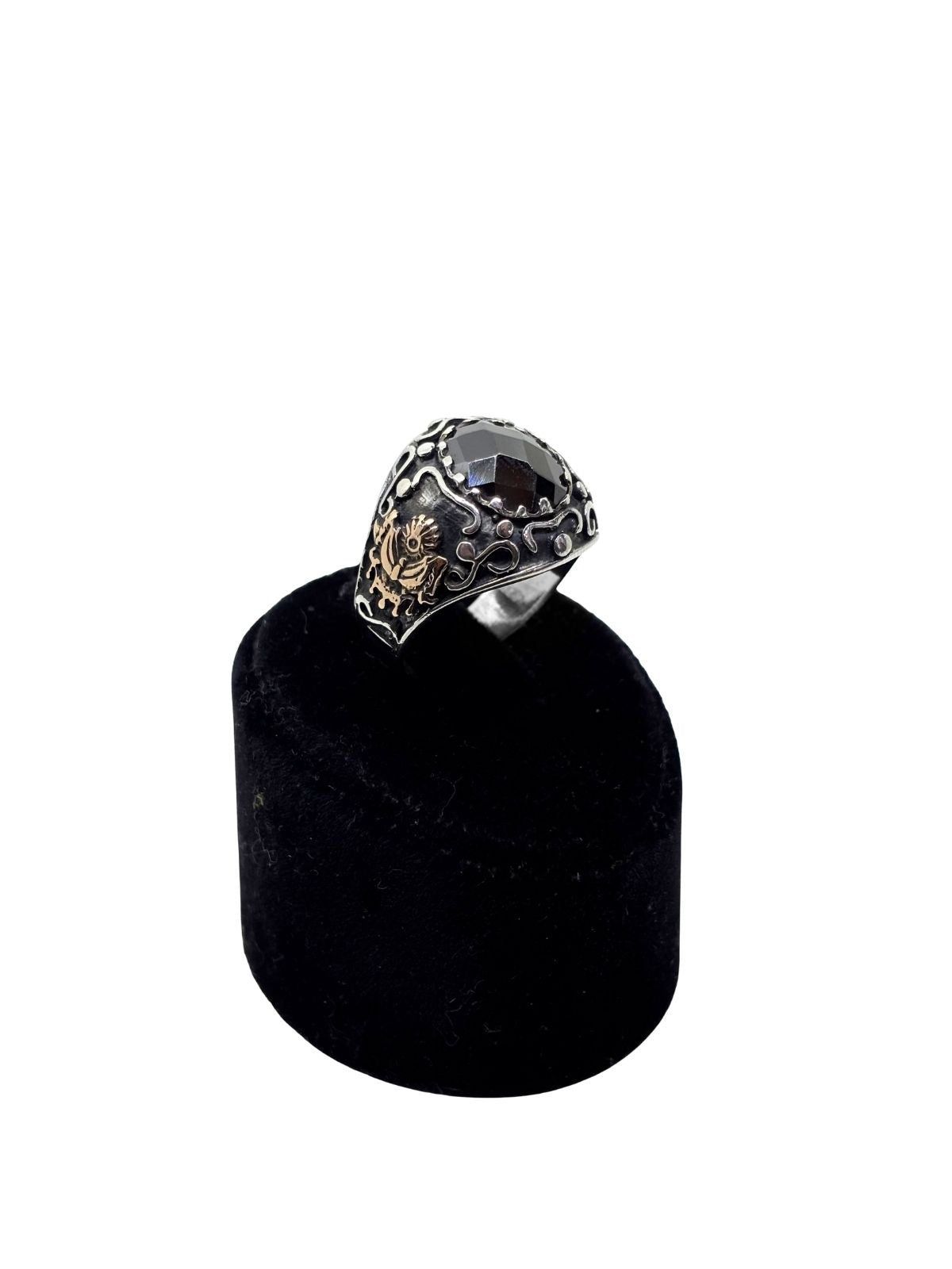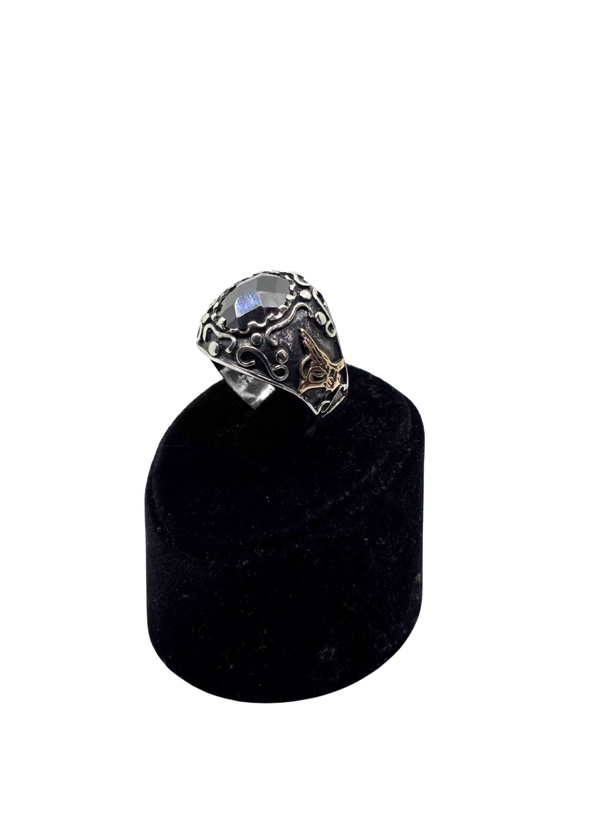Kesme Oniks Taşlı Tuğra ve Osmanlı Flama Motifli Gümüş Erkek Yüzük