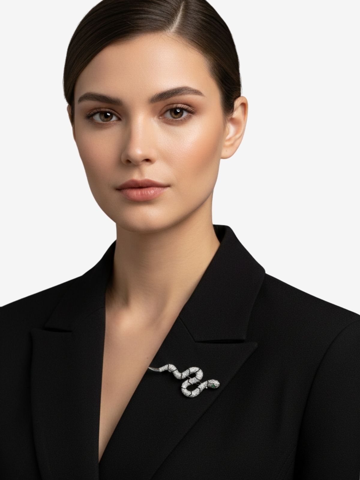 Beyaz Taşlı Yılan Gümüş Broş 5.7x2.5cm