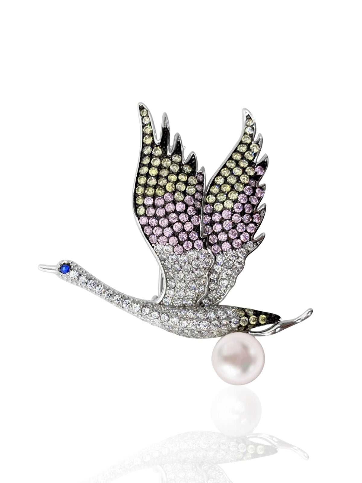 İnci ve Taş İşlemeli Gümüş Leylek Broş 5.5x5cm