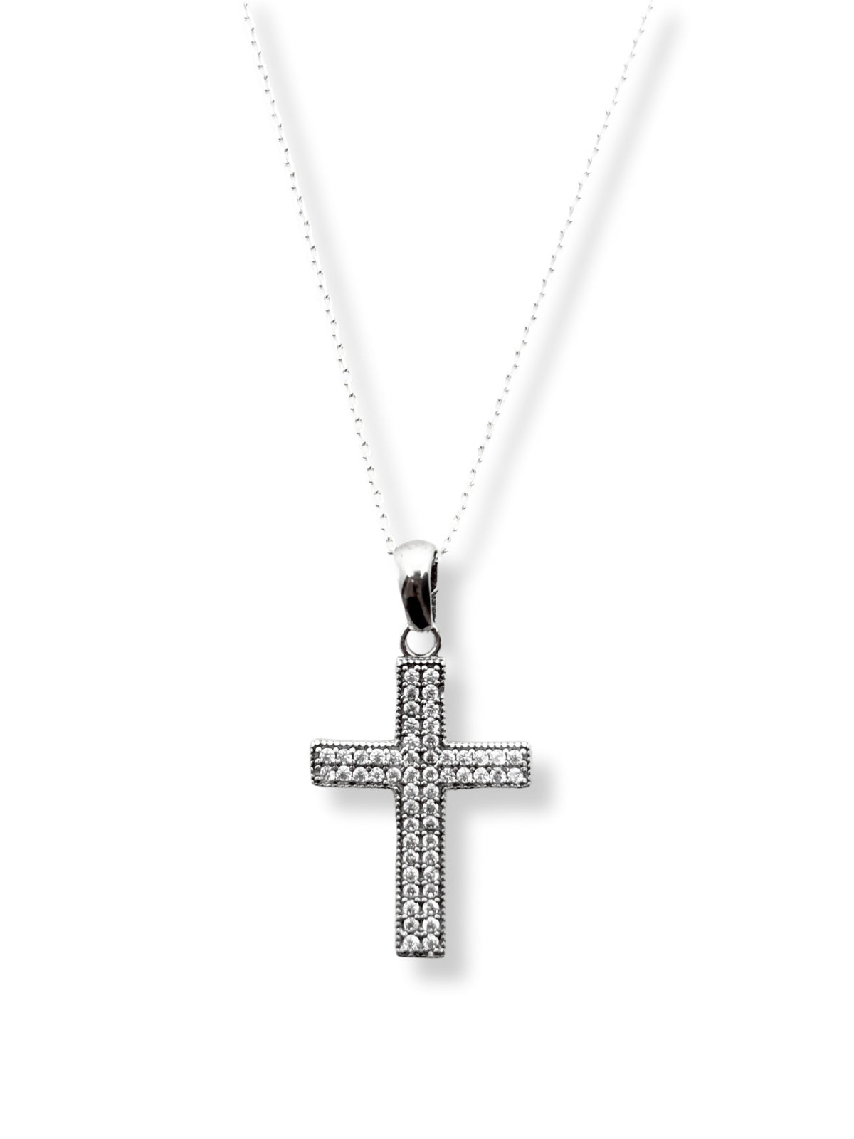 Çift Sıra Beyaz Taşlı Motifli Haç Gümüş Kadın Kolye