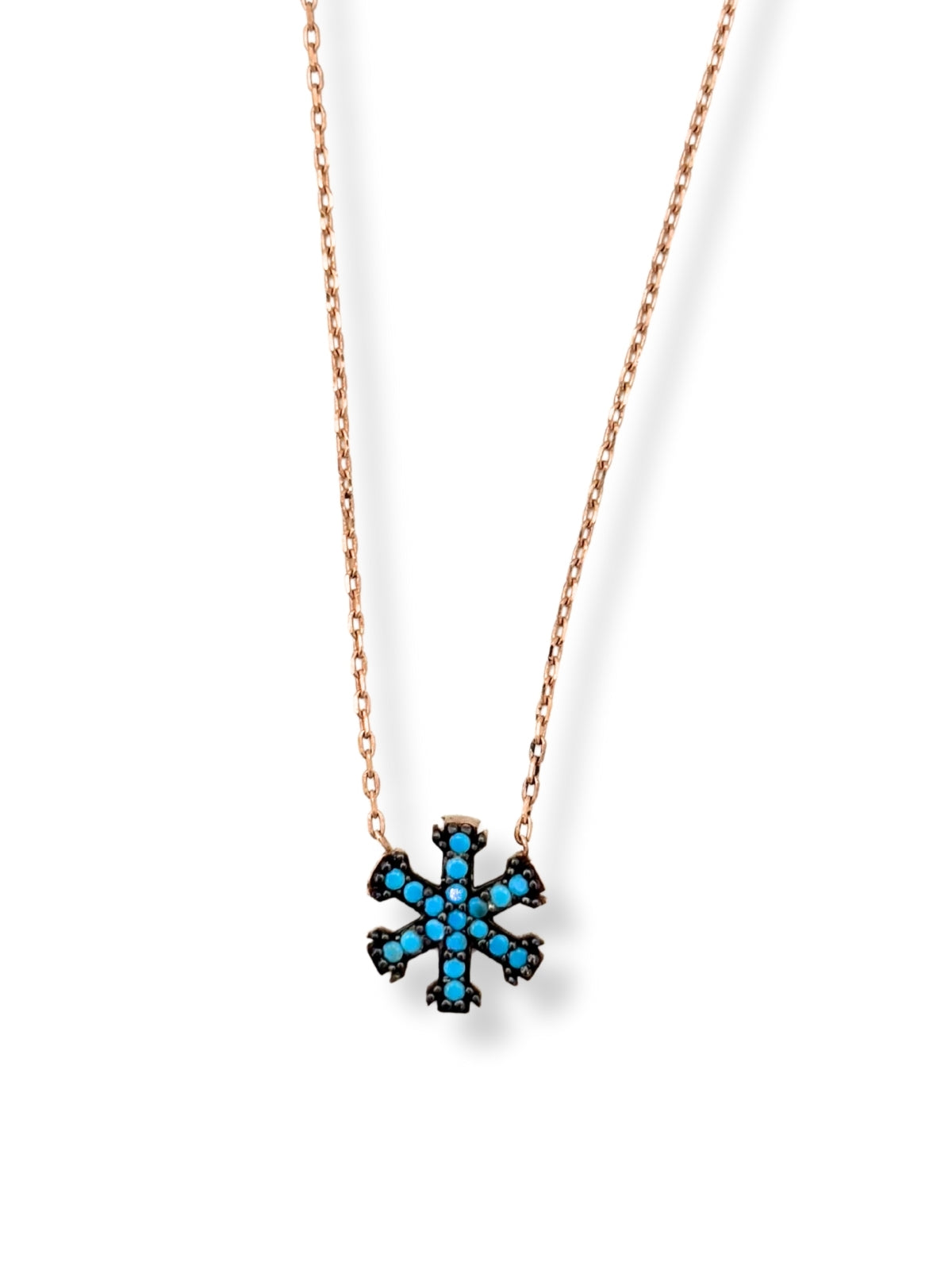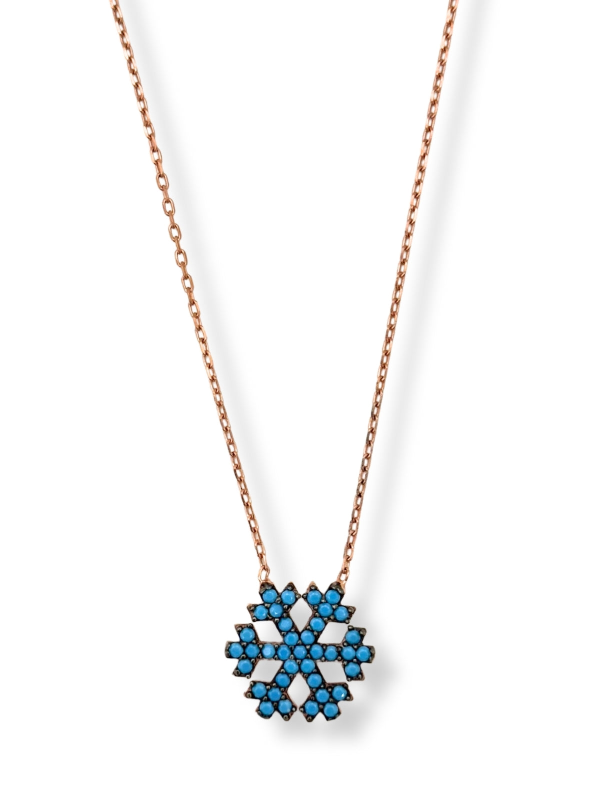 Rose Gold Turkuaz Işıltılı Kar Tanesi Hayalet Gümüş Kadın Kolye – Kışın Büyüsünü ve Zarafetini Taşıyan Özel Tasarım