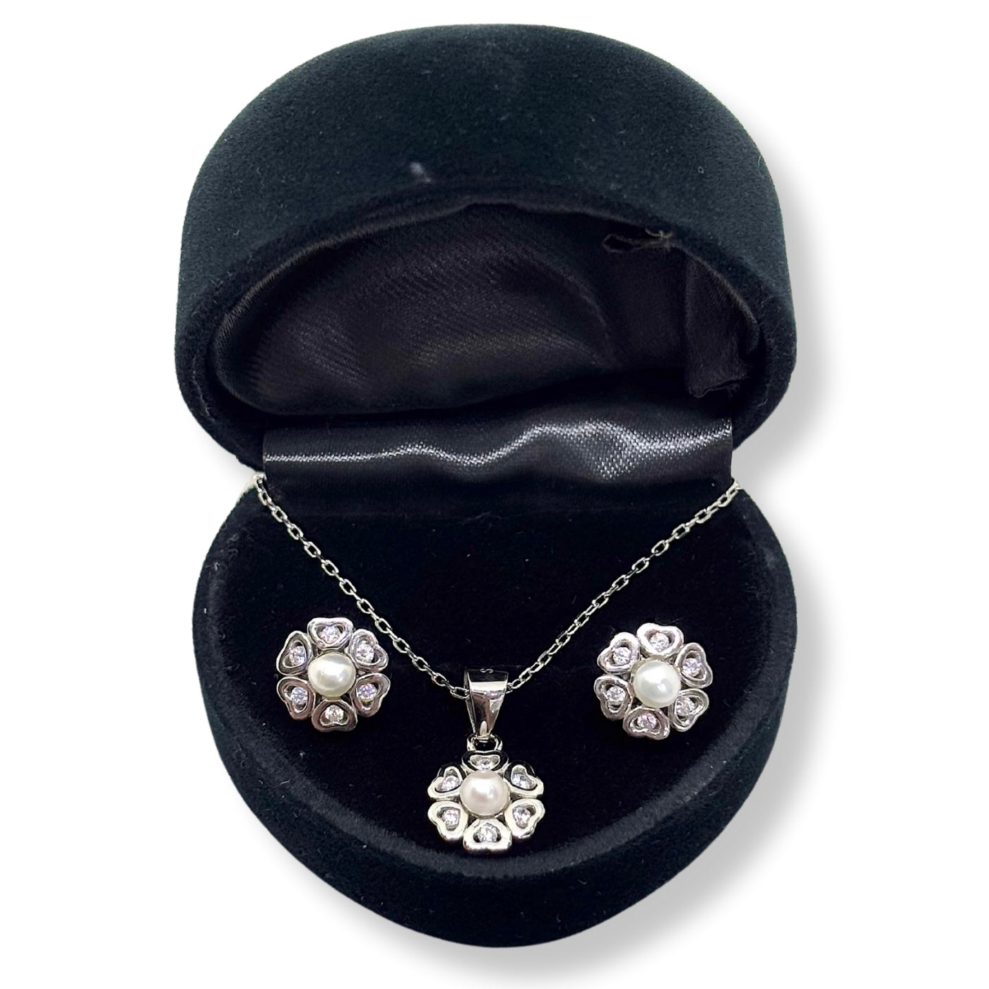 Işıltılı Kalplerle Çevrili Gümüş İnci Set&Takım
