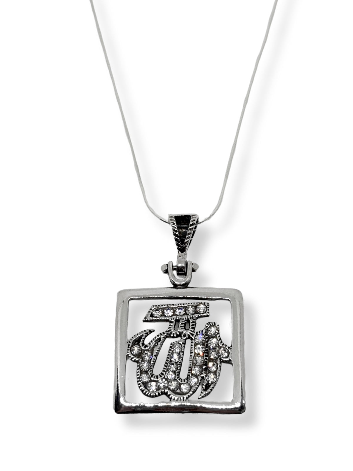 Kare Çerçeve İçinde Beyaz Işıltılı Allah Yazısı Gümüş Kadın Kolye