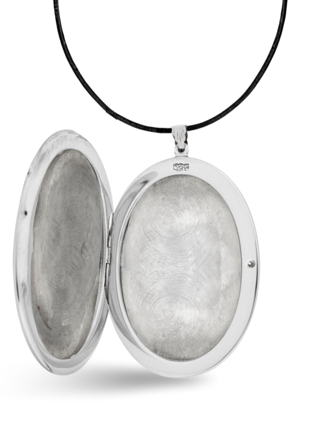 İri Oval Lazer İşlemeli Bombe Kapaklı Gümüş Kadın Kolye 7.7x4.5cm