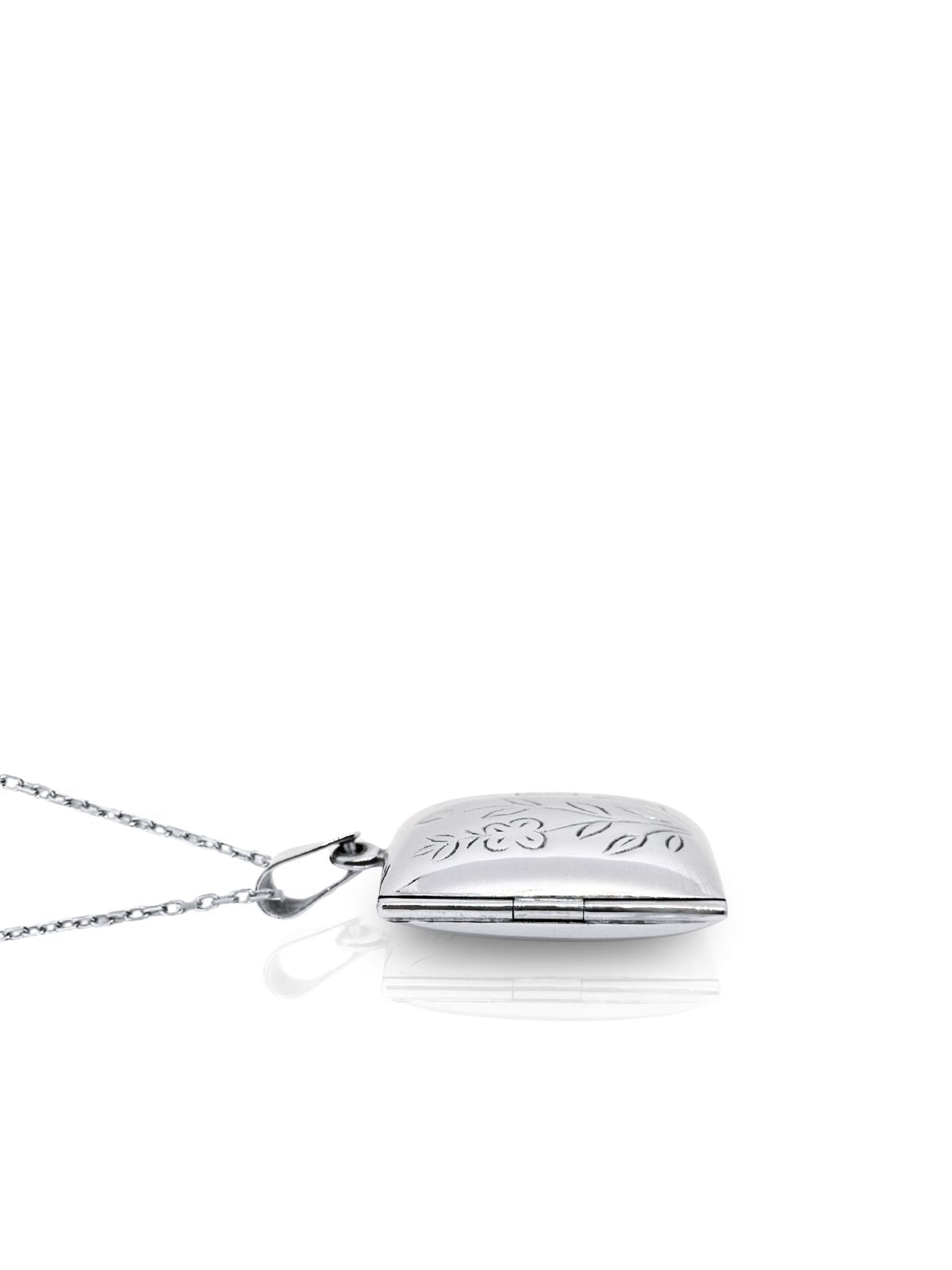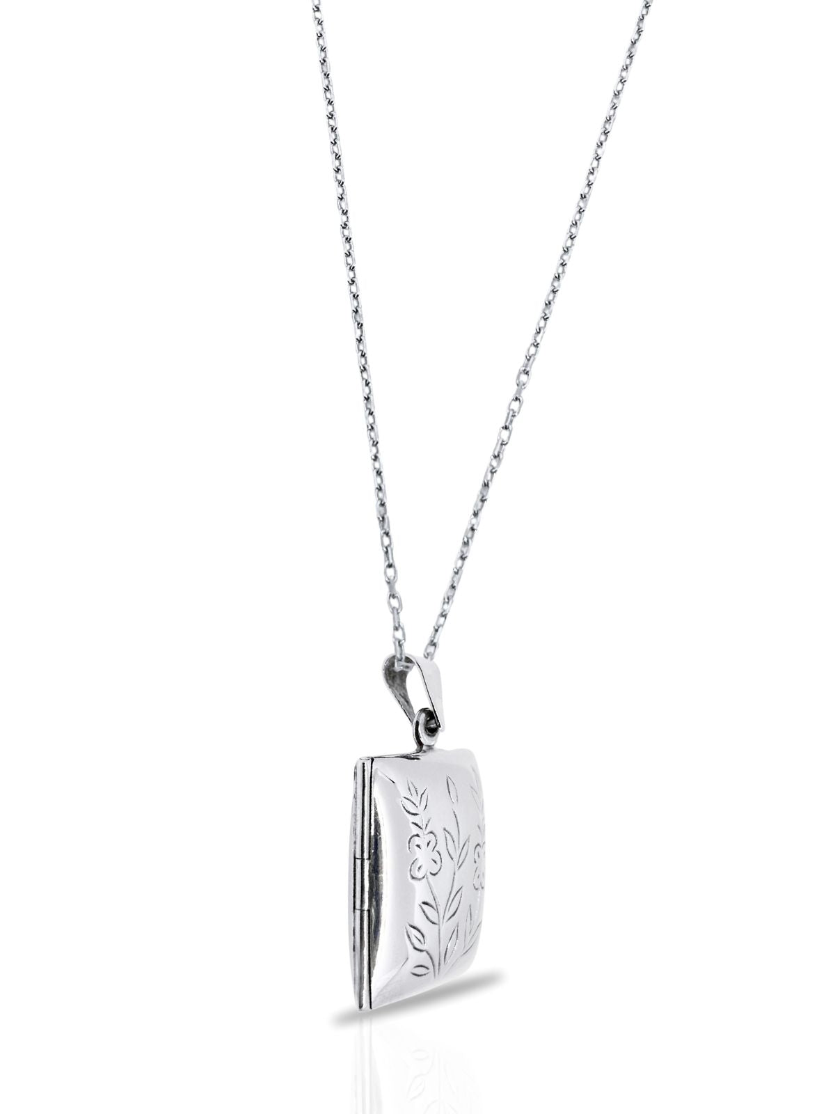 Lazer Çiçek Desenli Kare Bombe Kapaklı Gümüş Kolye 3.3x2 cm