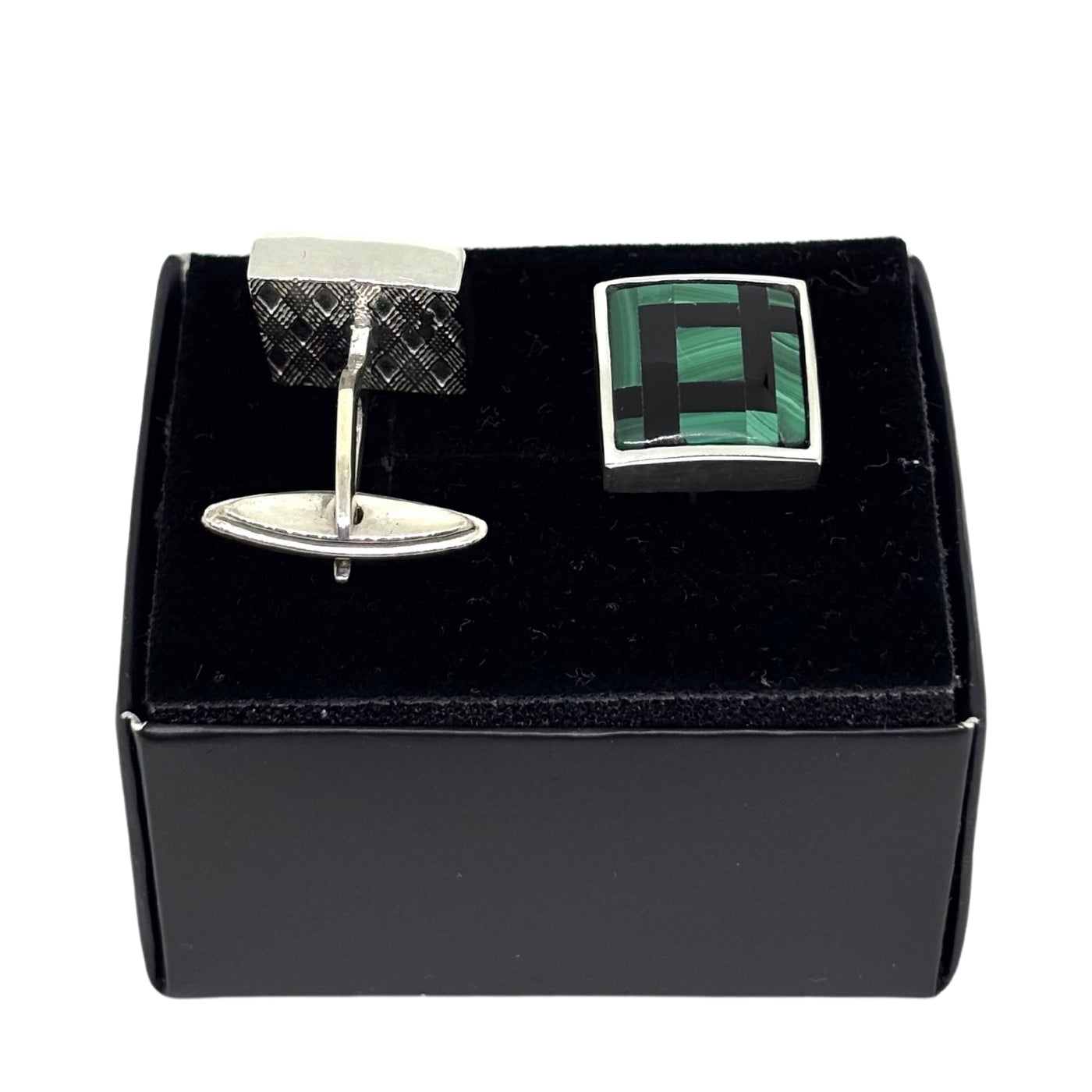 Gümüş Kare Yeşil Sedef ve Siyah Mineli Kol Düğmesi