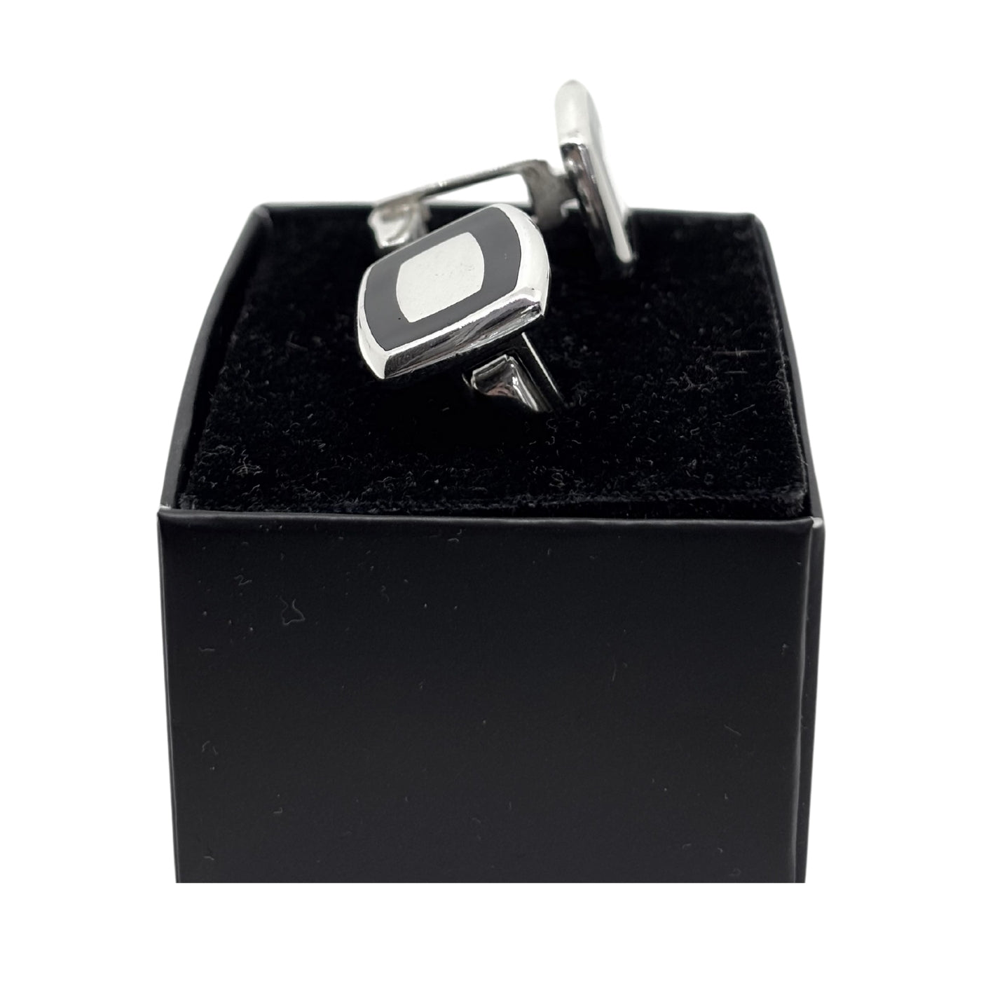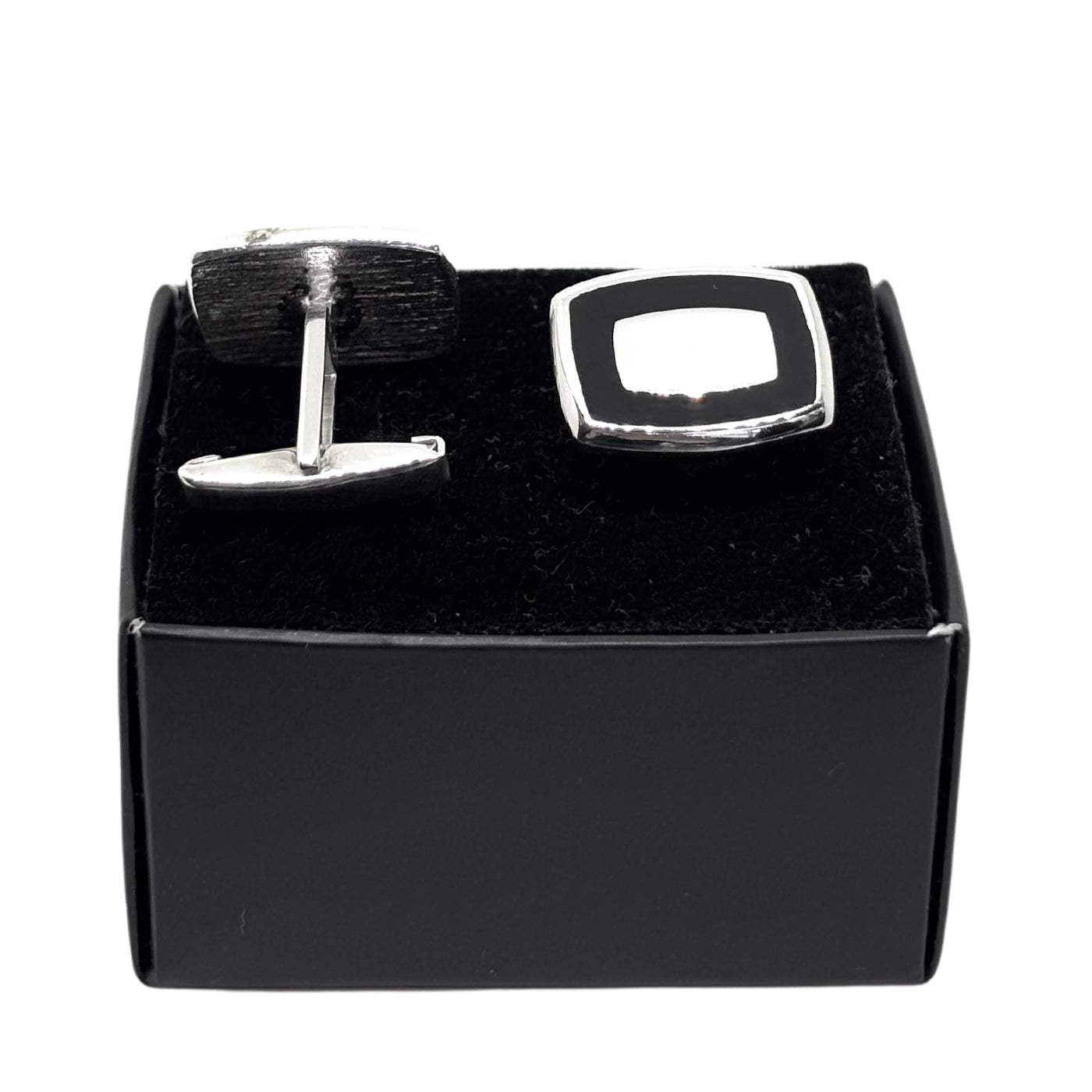 Siyah Mineli Dikdörtgen Gümüş Kol Düğmesi – Şıklık ve Zarafetin Modern Yorumu