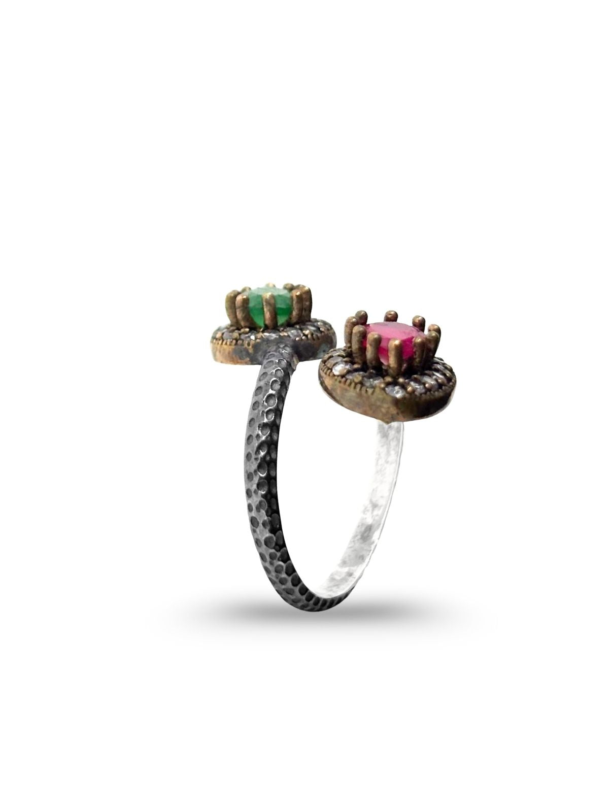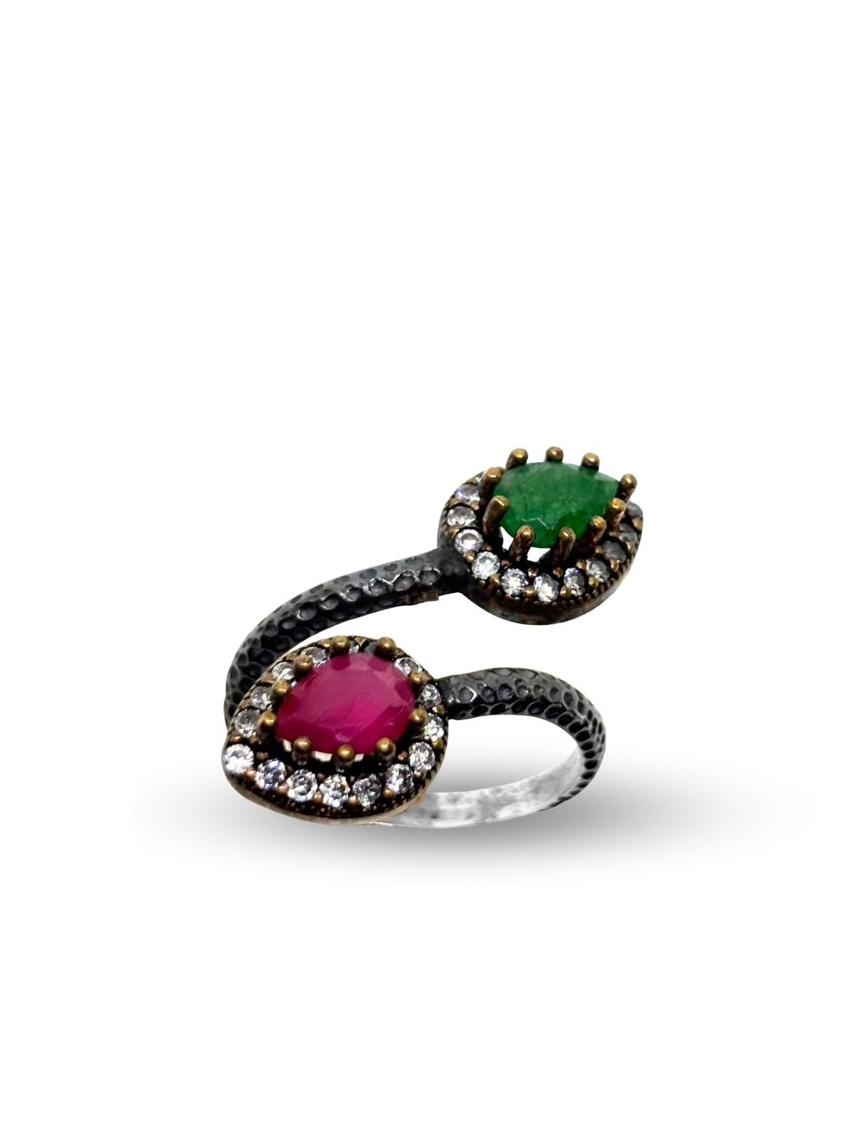 Otantik Ayarlanabilir Damla Yakut Zümrüt Gümüş Kadın Yüzük