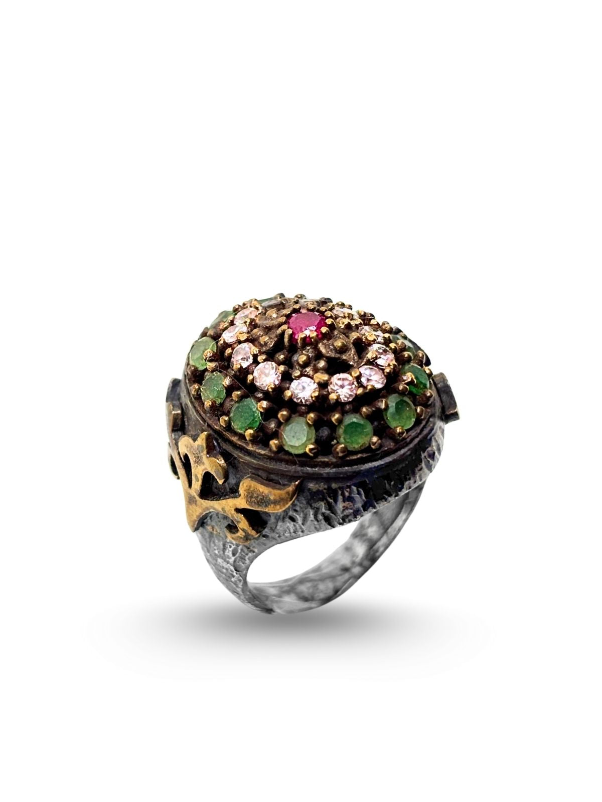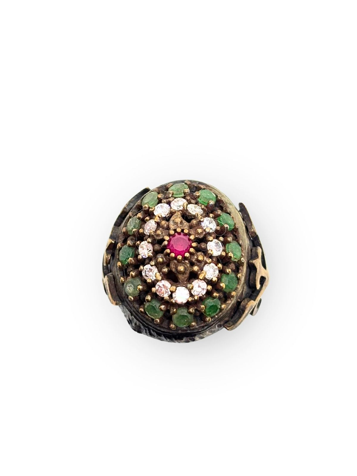 Otantik Yakut Zümrüt Zirkon Taşlı Gümüş Vintage Kadın Yüzük