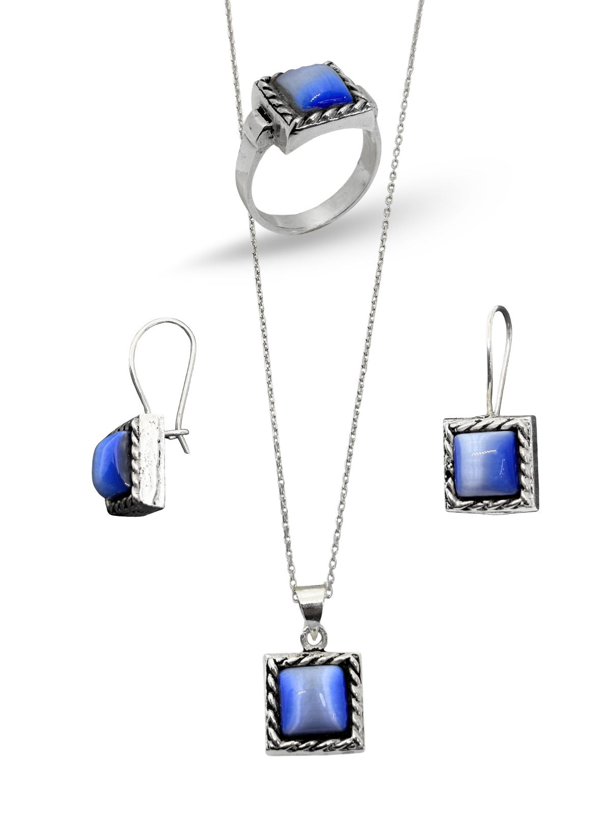 Set; yüzük, kolye ve küpeden oluşur. Sedef taşının doğal parlaklığı, lacivert tonlarıyla birleşerek asil ve etkileyici bir görünüm sunar. Günlük kullanımlarda zarif bir detay, özel günlerde ise klasik bir şıklık tamamlayıcısıdır.