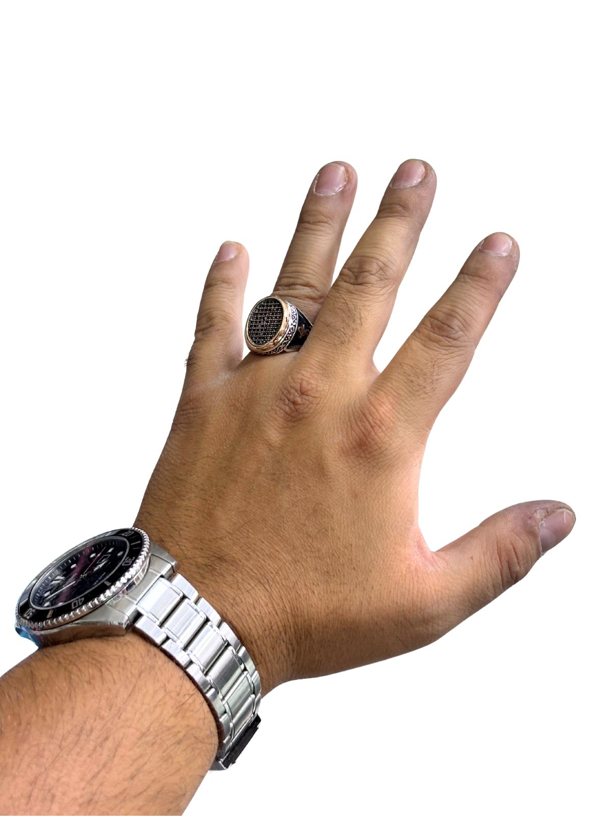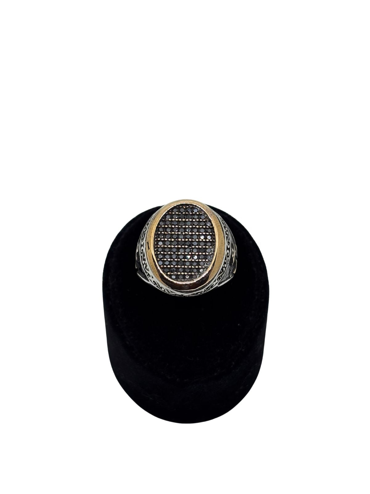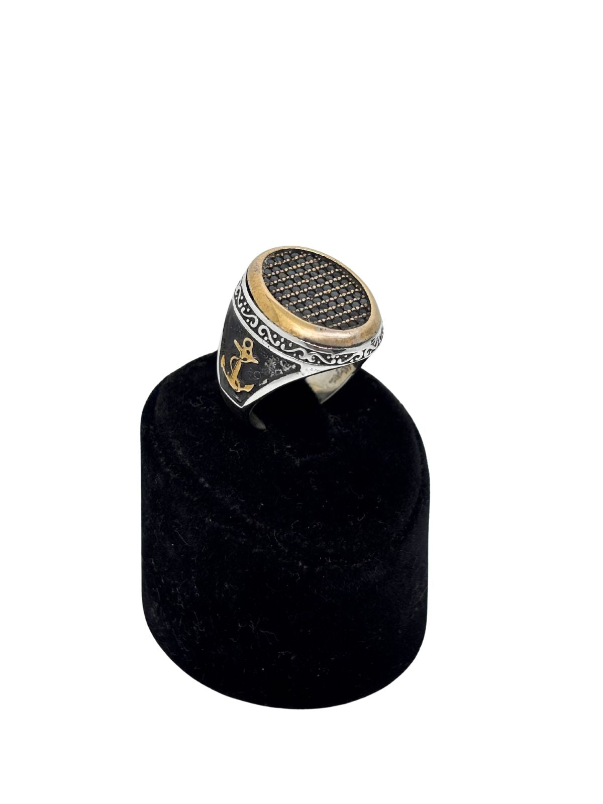 Oval Siyah Zirkon Taş Bezeli Çapa Motifli Gümüş Erkek Yüzük