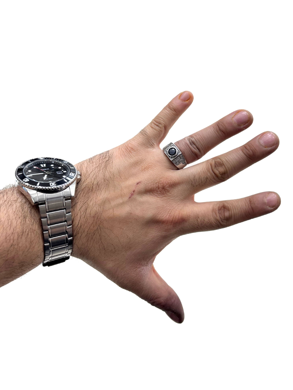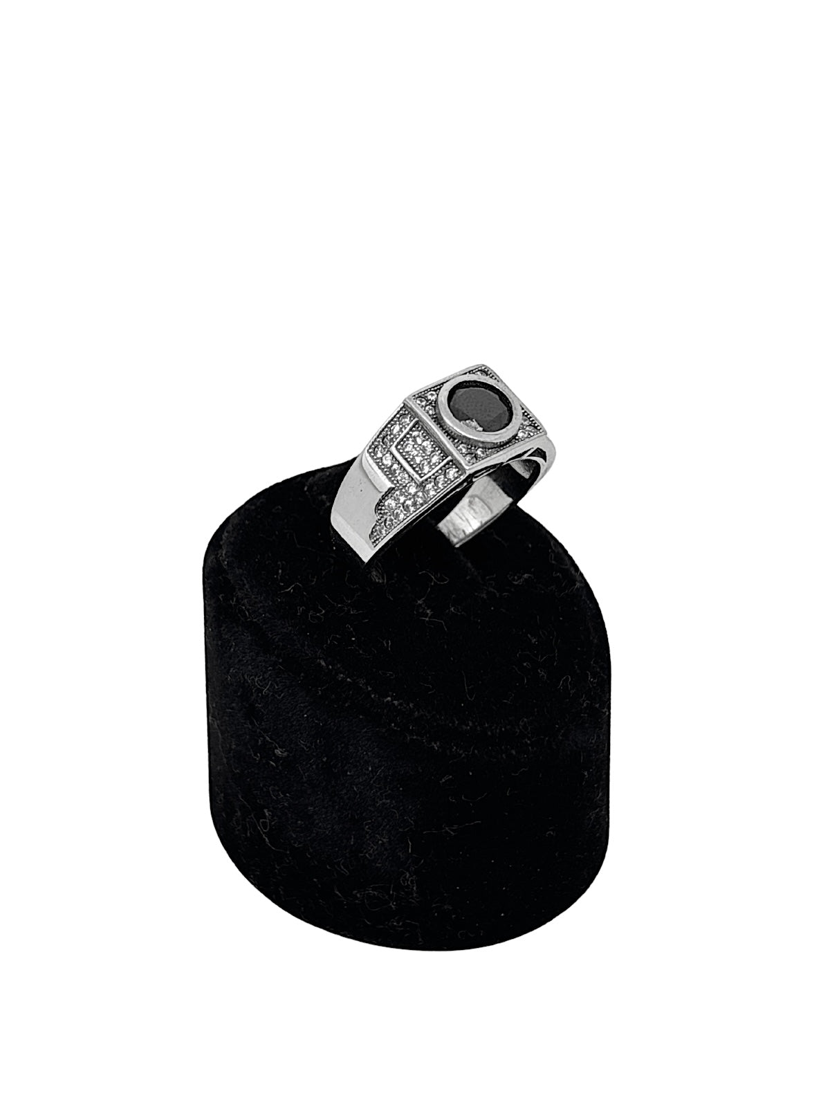 Beyaz Işıltı Çevrili Minimal Oniks Taşlı Gümüş Erkek Yüzük, 925 ayar gümüş kalitesi ve sade tasarımıyla modern erkeğin zarif stilini tamamlar. Yüzüğün merkezinde yer alan derin siyah oniks taşı, etrafını saran beyaz ışıltılı detaylarla güçlü bir kontrast oluşturarak asil bir duruş sergiler.