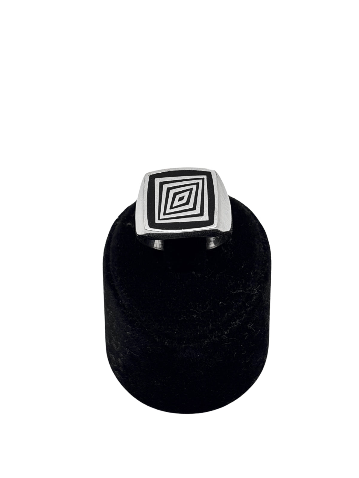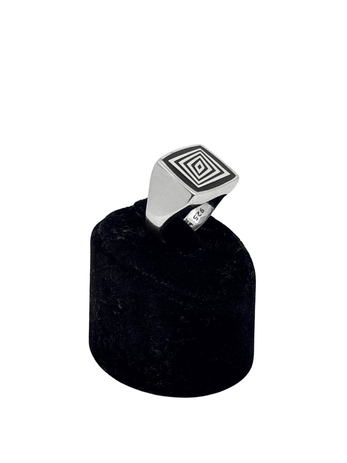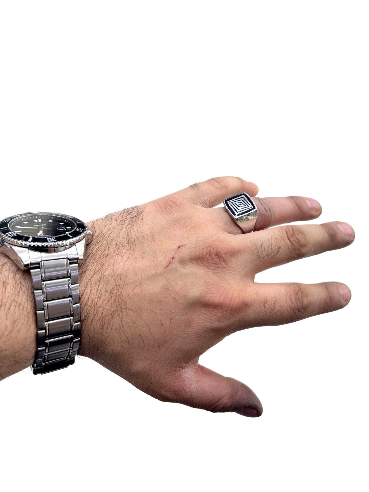 Dalga Desenli Siyah Mineli Kare Gümüş Erkek Yüzük
