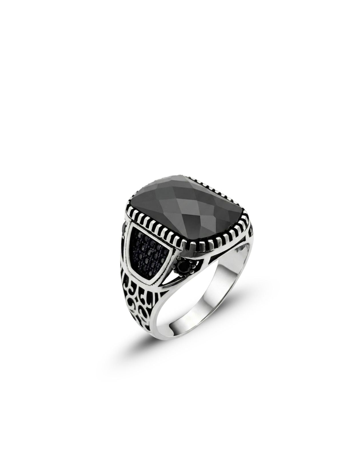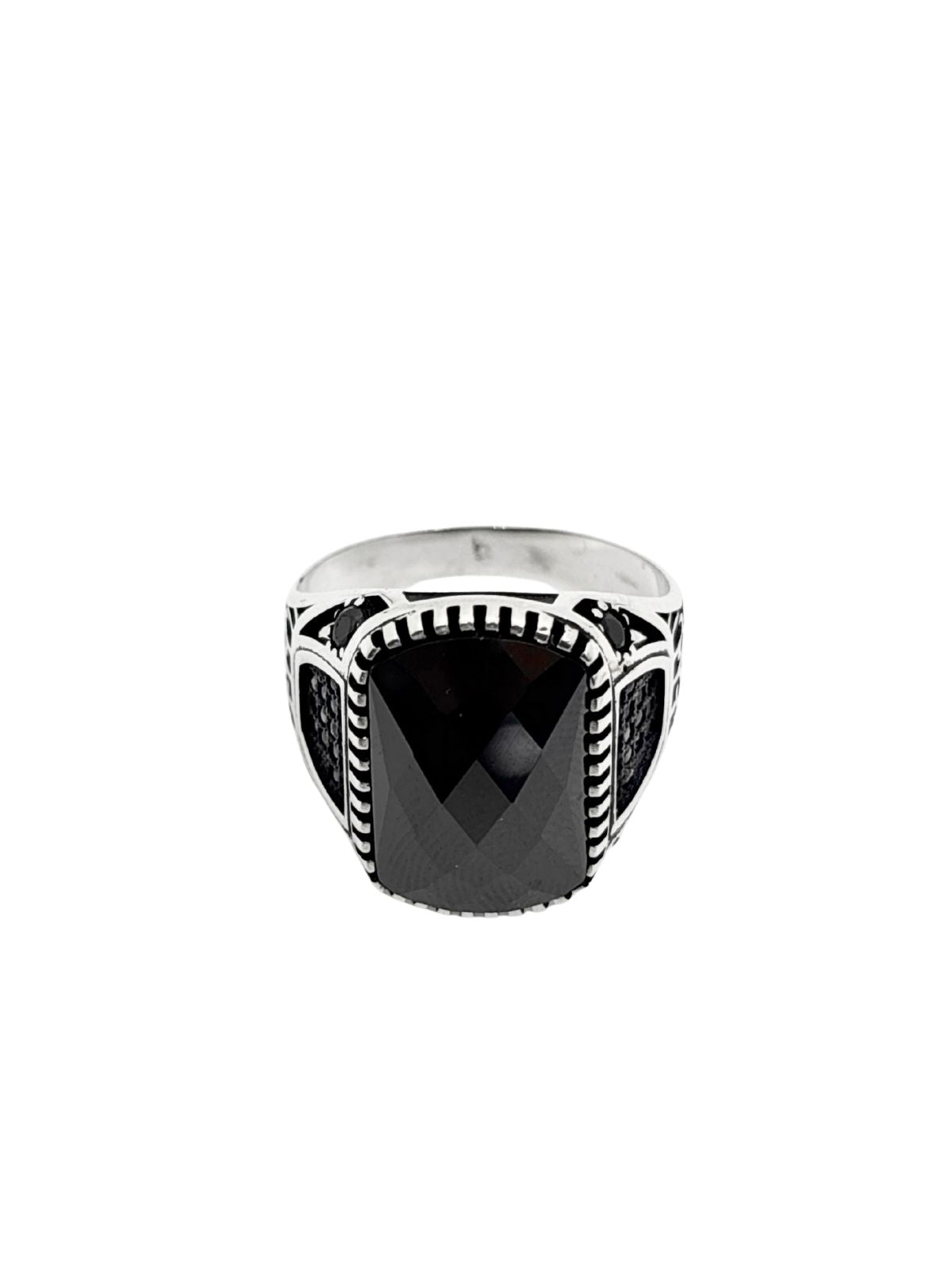 İri Kesme Oniks Taşlı Zirkon Detaylı Gümüş Erkek Yüzük