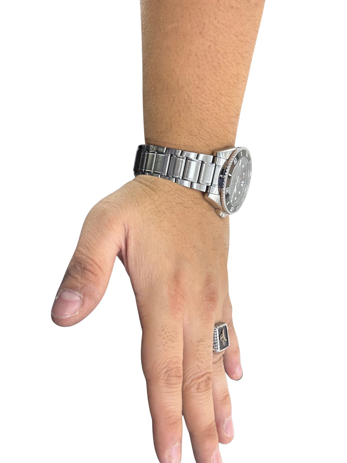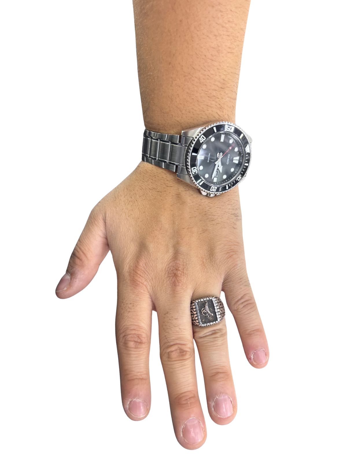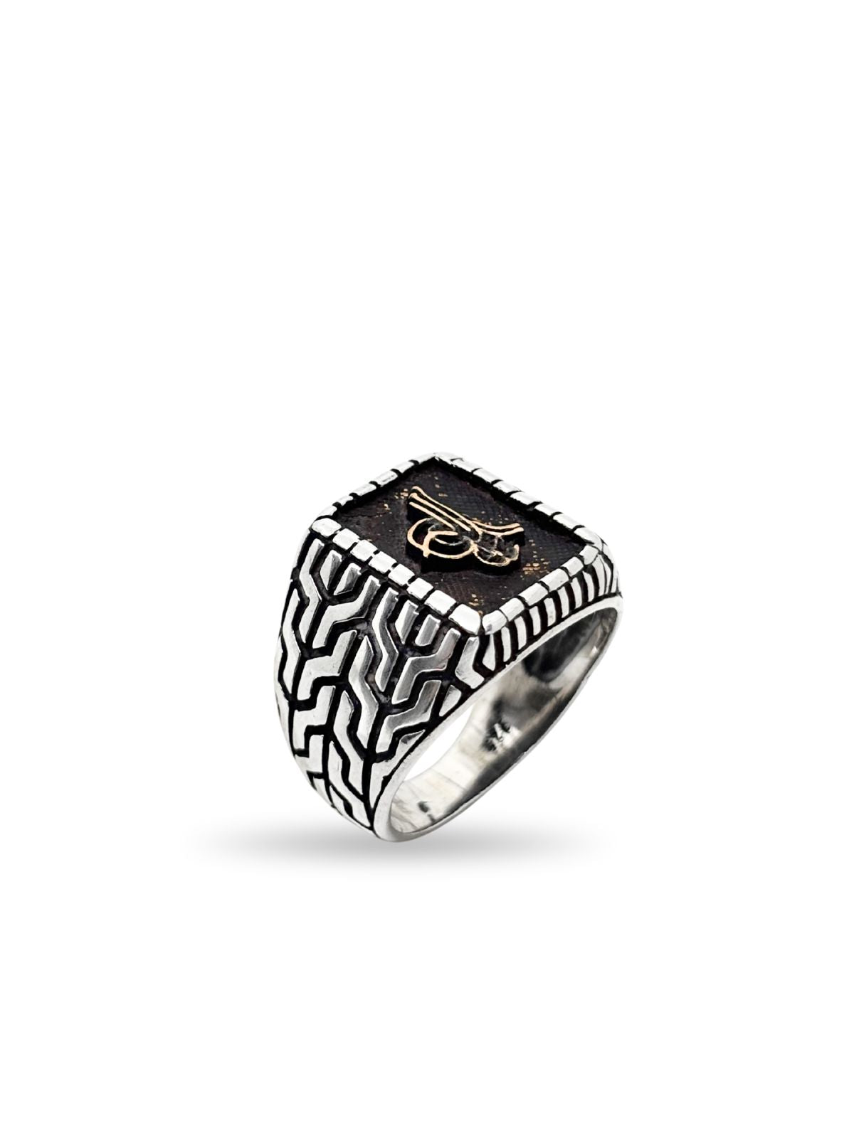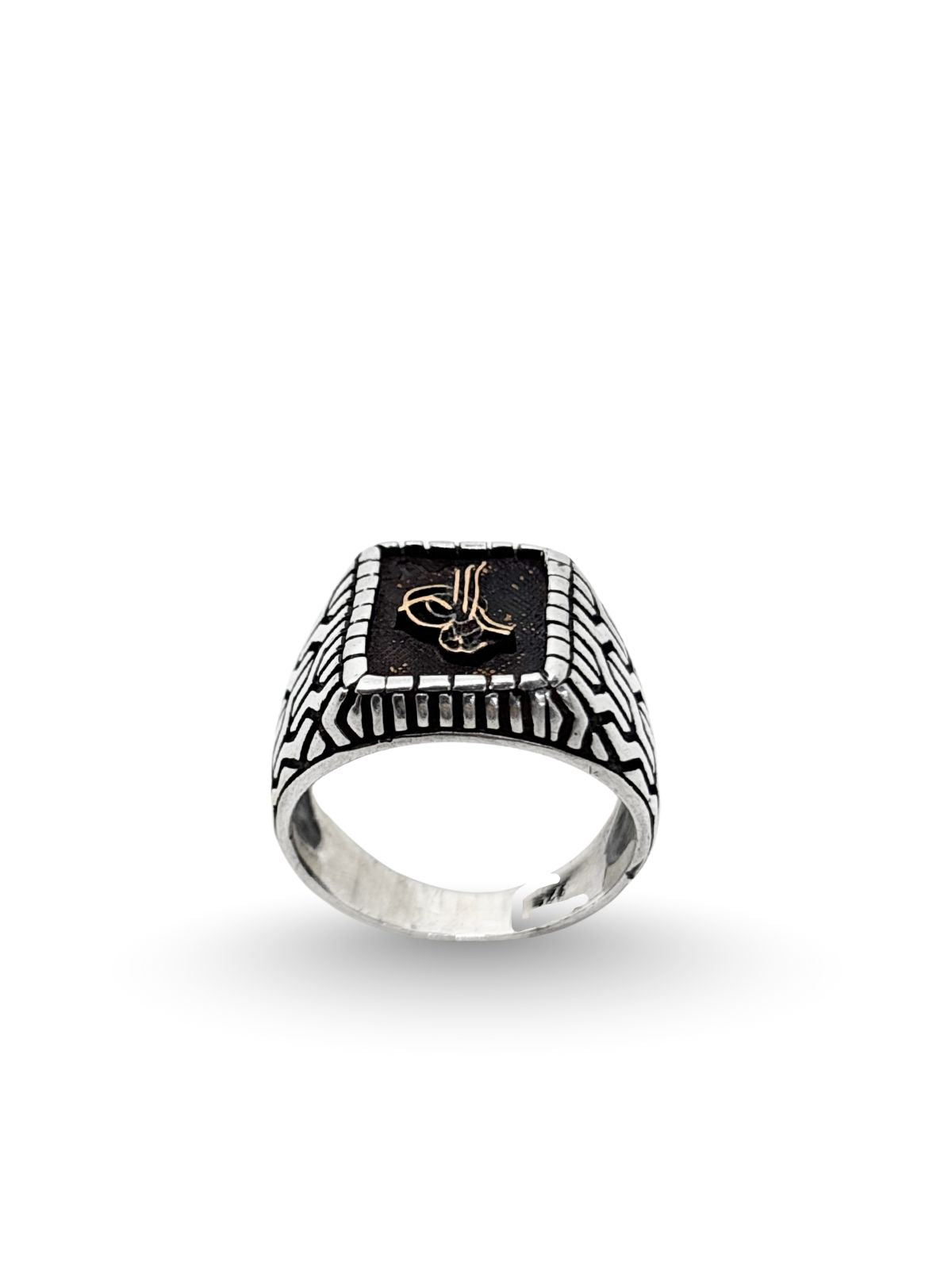 Retro çizgilerle tasarlanan bu özel model, merkezinde yer alan kare formdaki tuğra detayıyla dikkat çeker. Tuğranın belirgin ve özenli işçiliği, yüzüğe karakteristik bir duruş kazandırırken, kalemli gövde detayları modele hem derinlik hem de estetik bir görünüm katar. Yan yüzeylerdeki ince işlemeler, yüzüğün maskülen ve klasik-retro tarzını tamamlar.