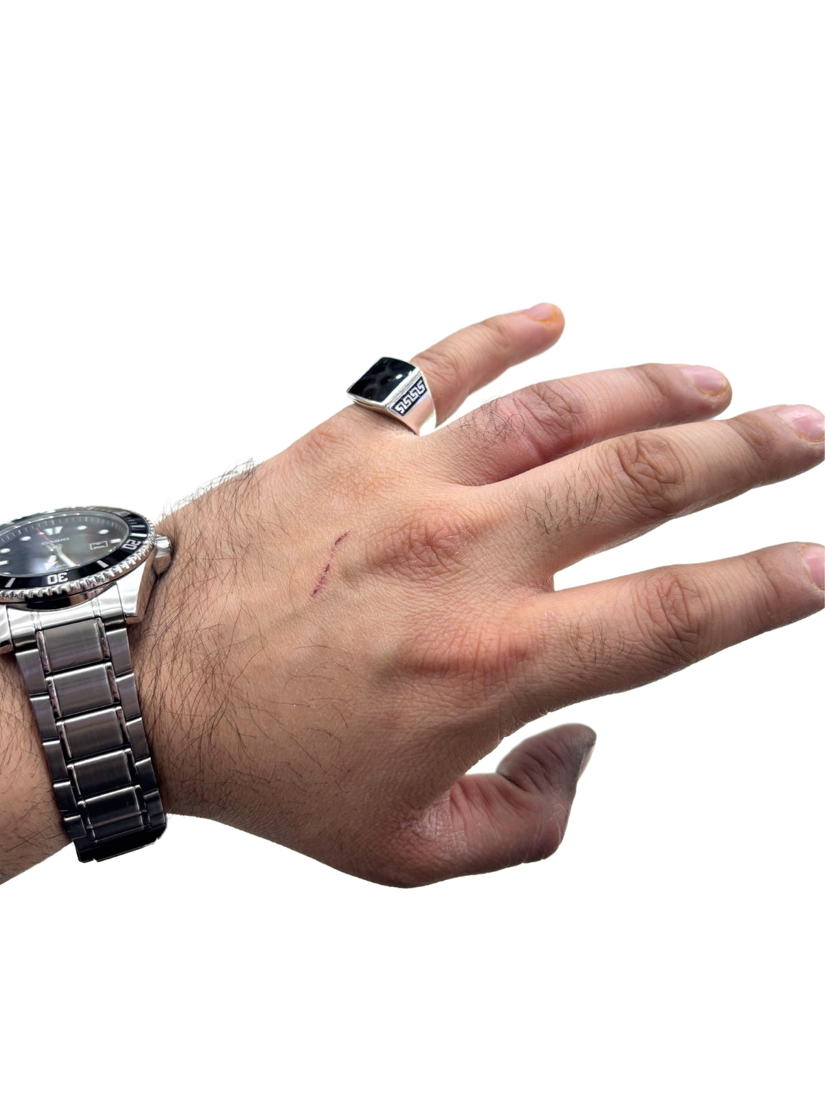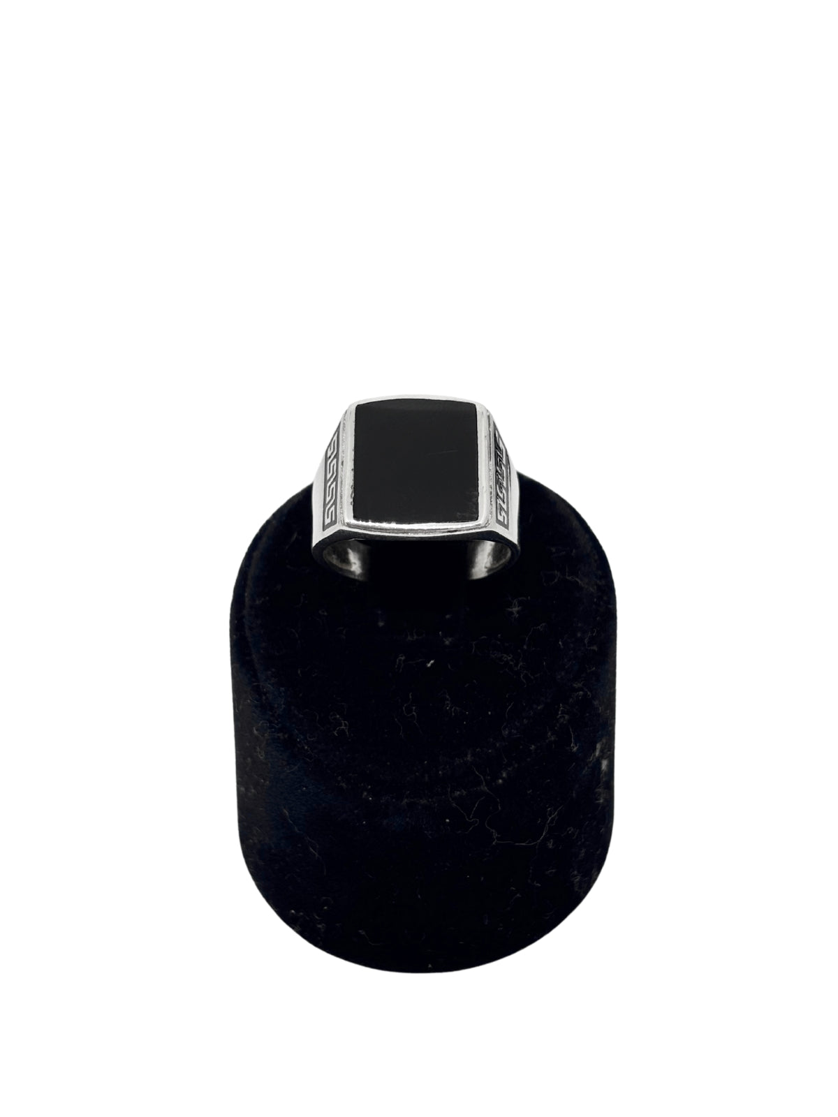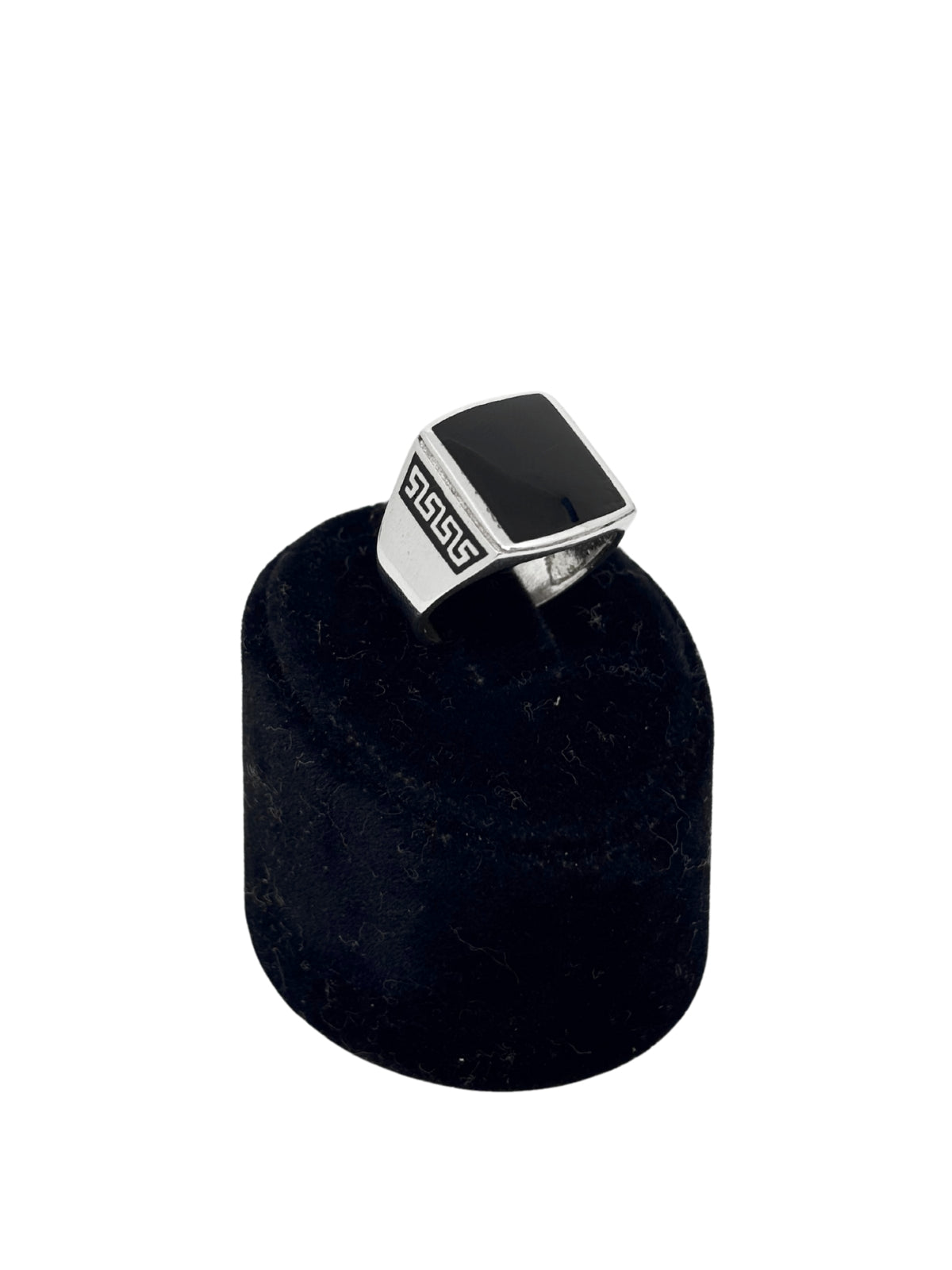 Yatay Greg Desenli Kenar Siyah Mineli Gümüş Erkek Yüzük