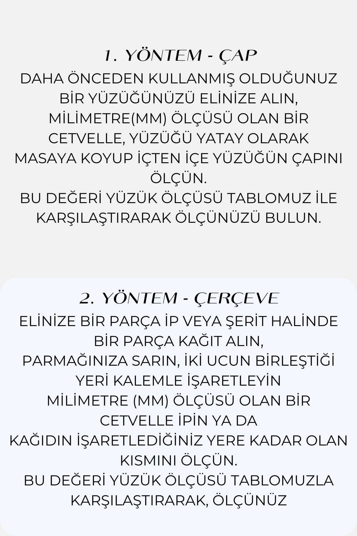 BU DEĞERİ YÜZÜK ÖLÇÜSÜ TABLOMUZLA KARŞILAŞTIRARAK, ÖLÇÜNÜZÜ BULUN.