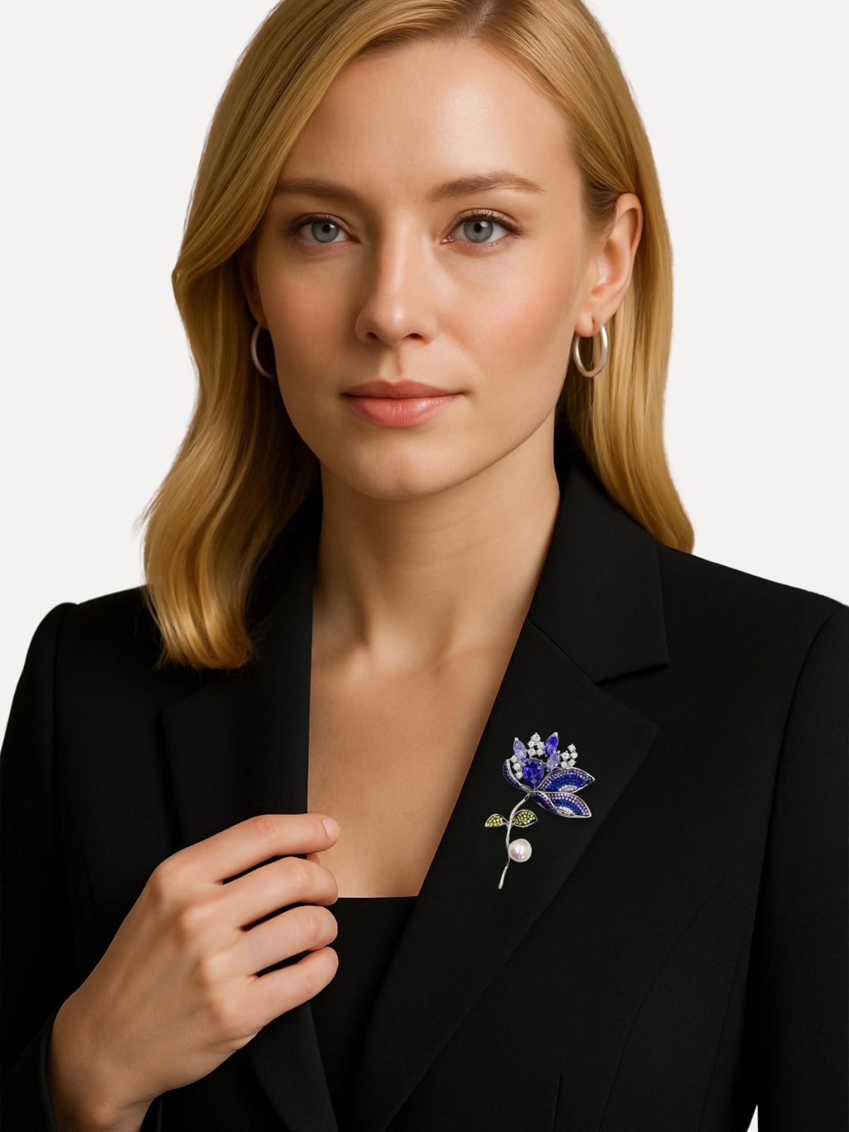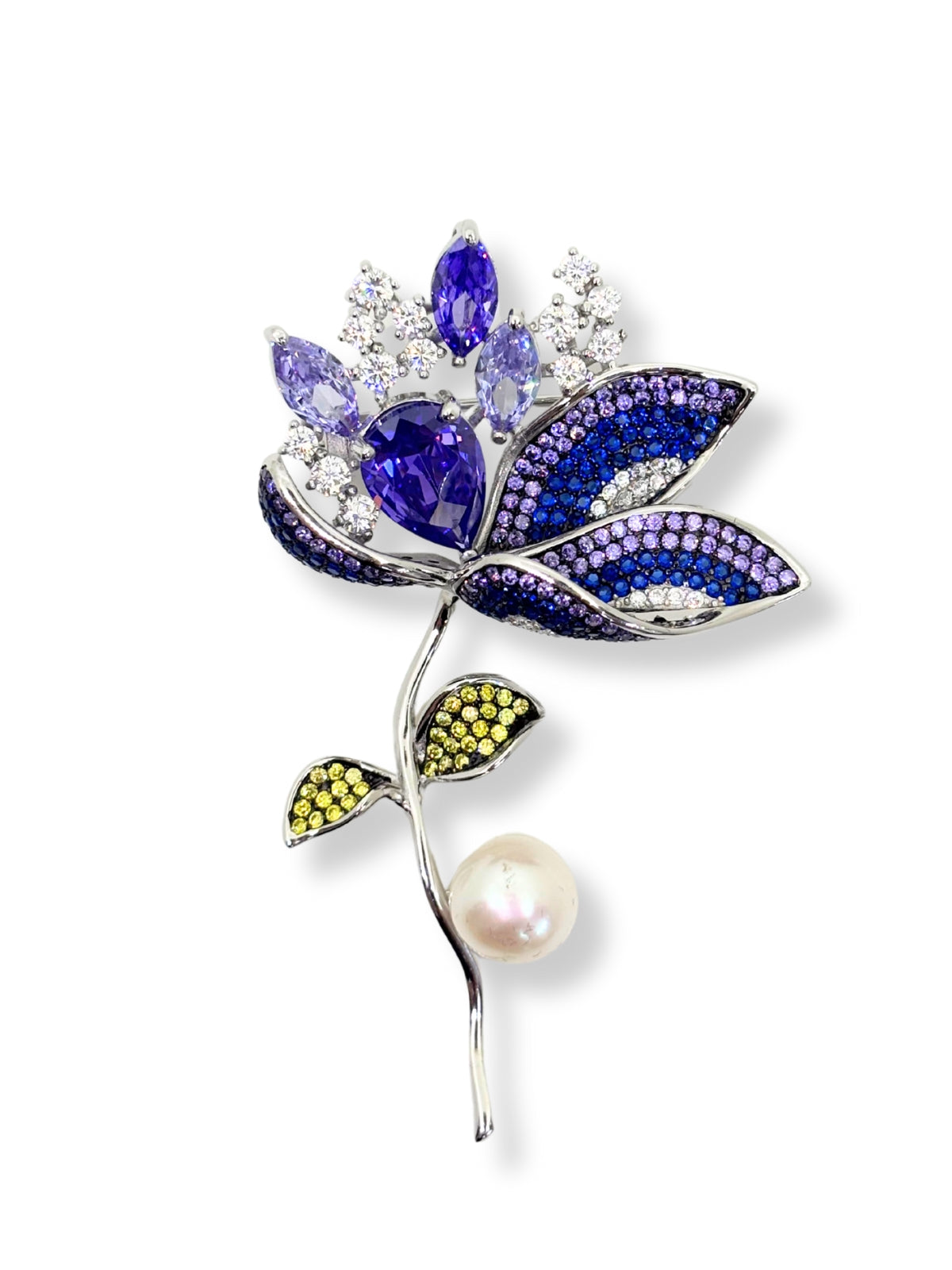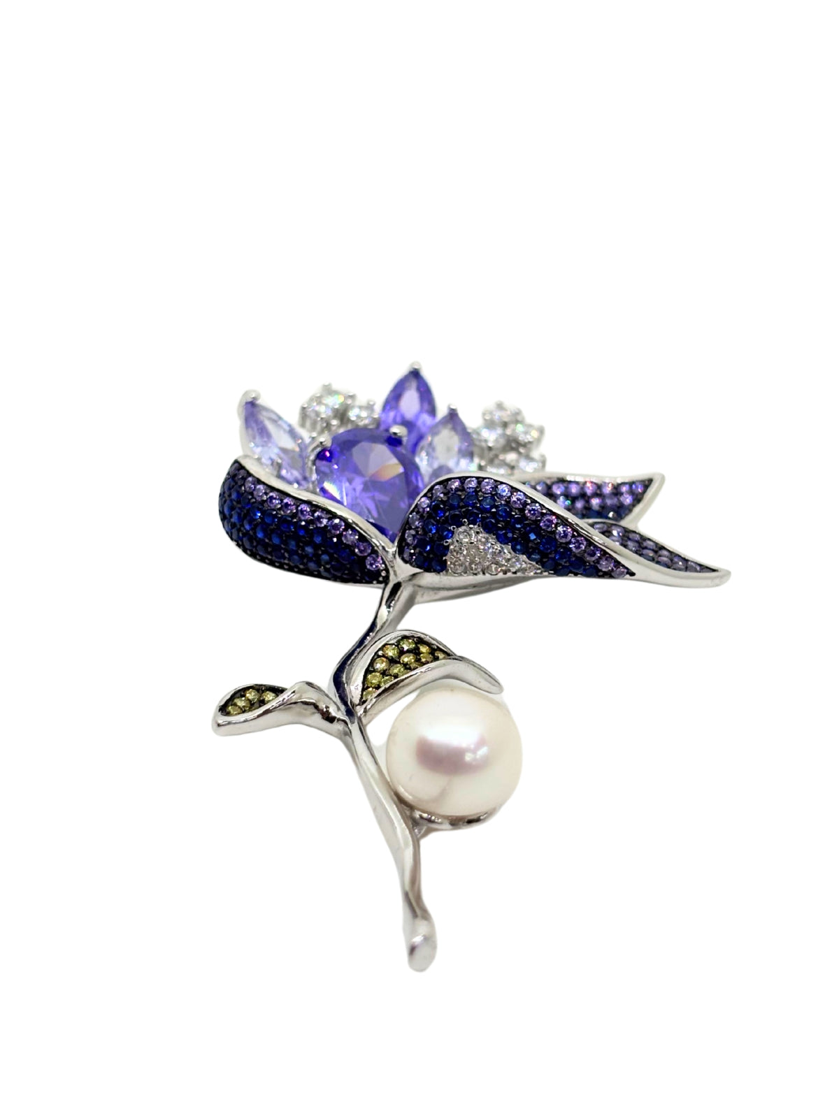 İri Ametist Safir Zirkon Taşlı İnci Detaylı Çiçek Gümüş Broş Yaka İğnesi