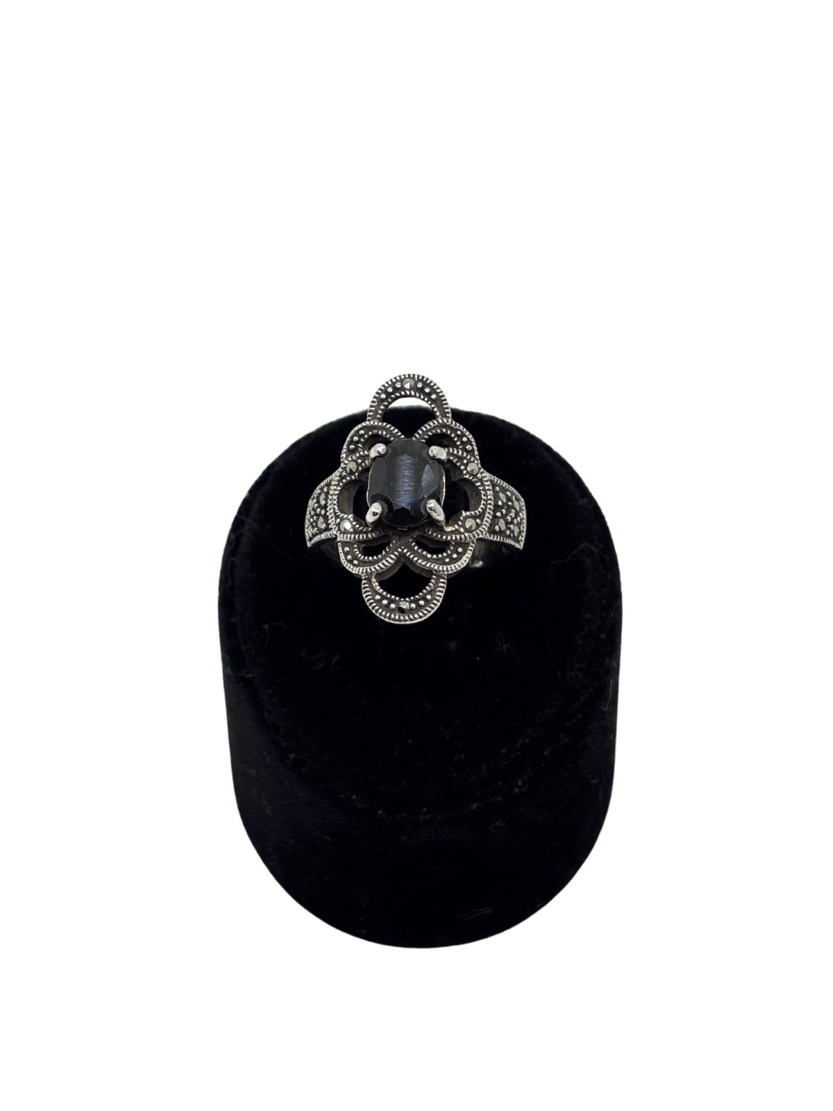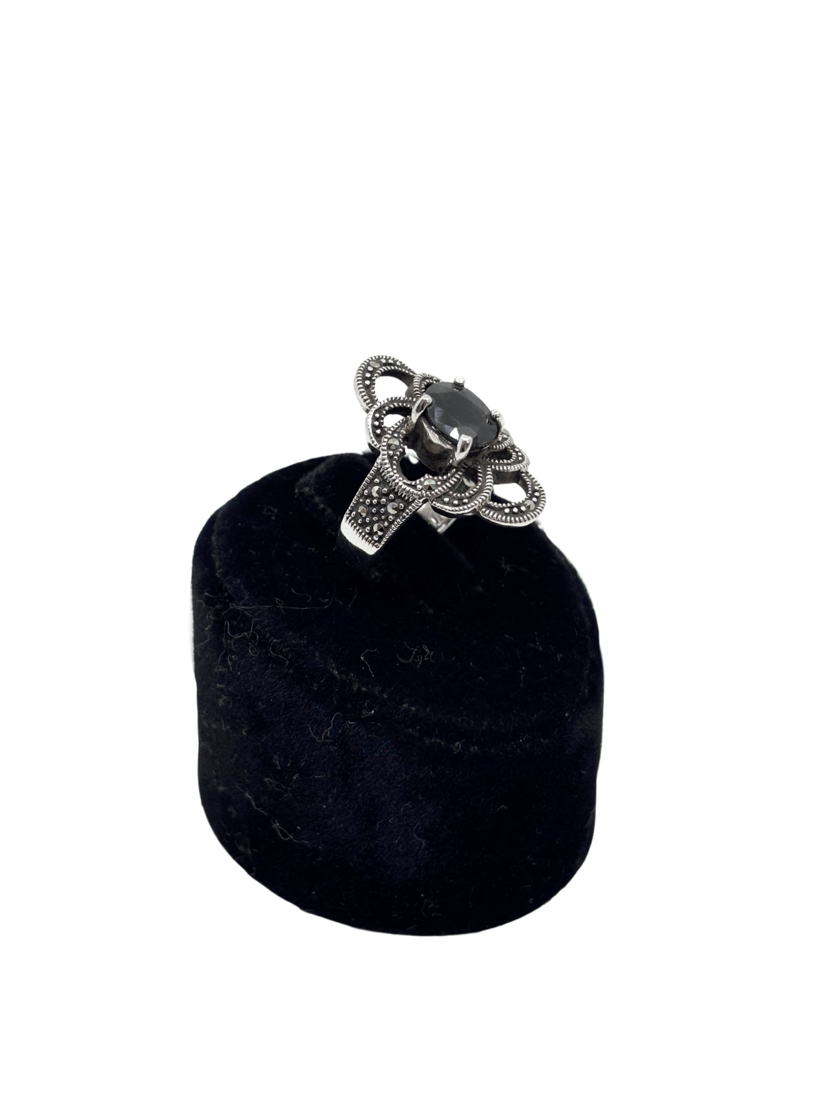 Markazit Işıltı Çevrili Oniks Taşlı Barok Desen Gümüş Kadın Yüzük