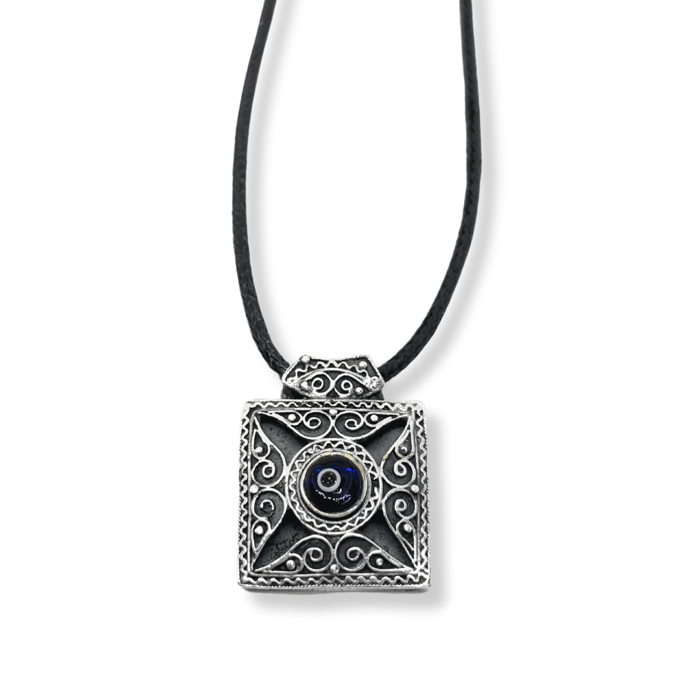 Authentic İşlemeli Kare Madalyon Üzerine Nazar Gümüş Kolye/Araç Aynası Dekoru