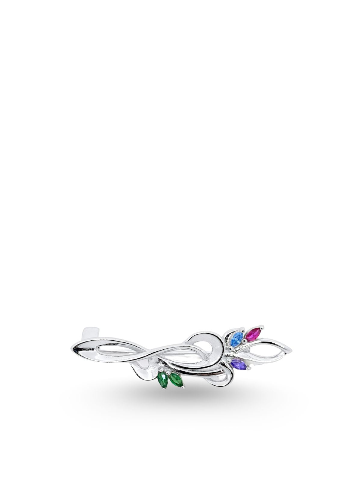 Işıltısı ve modern çizgileriyle dikkat çeken Renkli Taşlı Sarmal Gümüş Broş, zarafeti ve dinamizmi bir araya getirir. 925 ayar gümüşten üretilen bu özel broş, ametist, pembe kuvars ve beyaz zirkon taşlarıyla renkli bir armoni sunar. Taşlar tırnaklı ve gömme sistemle yerleştirildiği için düşme riski bulunmamaktadır.