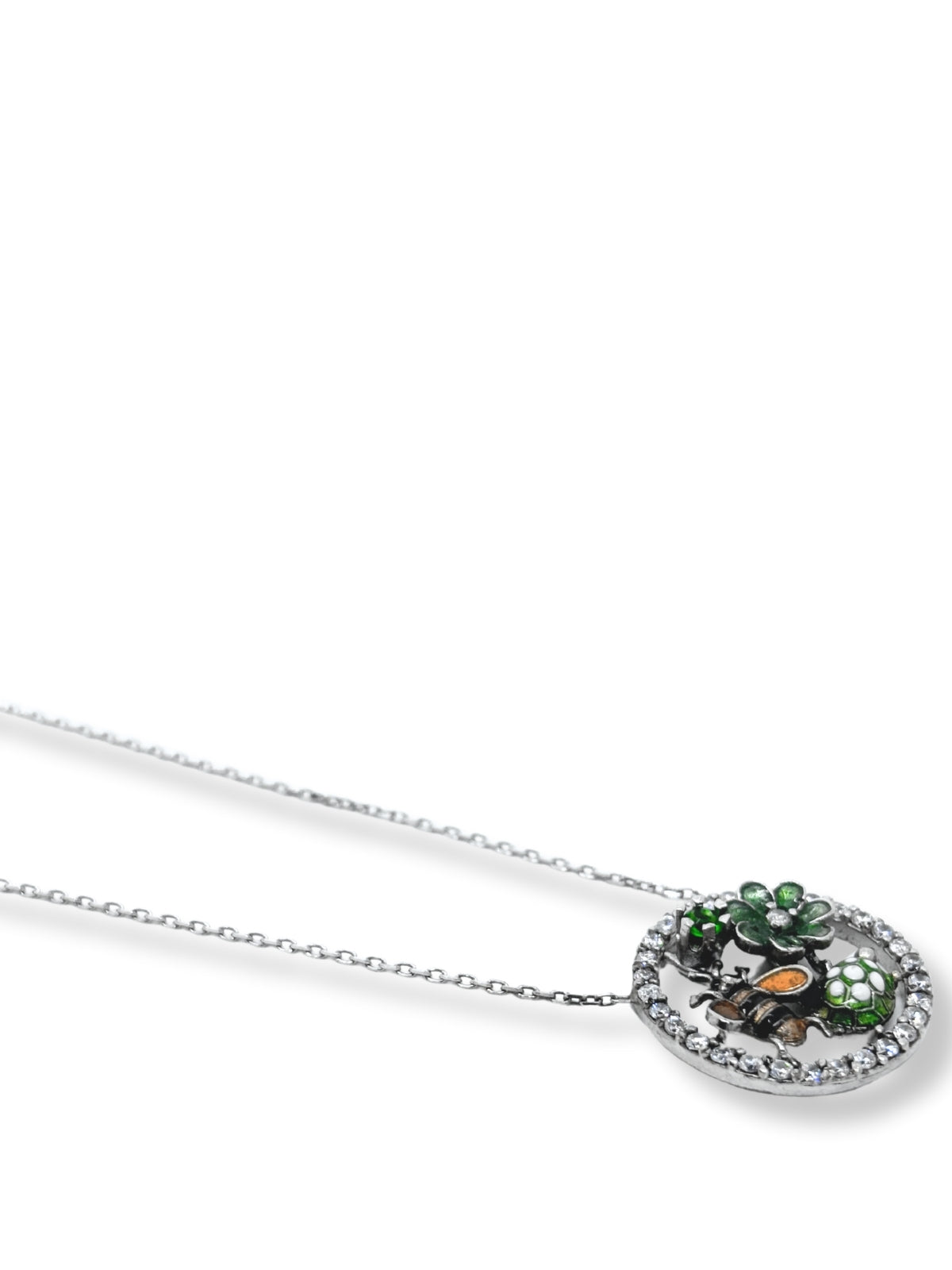Arı, çalışkanlık ve bereketi simgelerken, kaplumbağa uzun ömrü ve koruyucu enerjiyi temsil eder. Çiçek figürü ise doğanın saflığını ve yenilenmeyi yansıtır. Hayalet kolye tasarımı, figürlerin ve taşların zarafetini ön plana çıkararak sofistike bir duruş kazandırır.