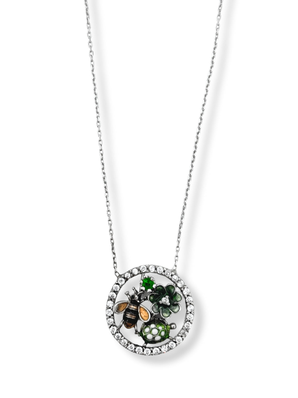 Beyaz Işıltılı Çevrili Doğanın Mücevherleri Mineli Hayalet Gümüş Kadın Kolye, doğanın büyüleyici güzelliğini ve anlamını yansıtan özel bir tasarıma sahiptir. 925 ayar gümüşten üretilen bu zarif kolye, beyaz taşlarla süslenmiş yuvarlak halka içerisinde yer alan arı, kaplumbağa ve çiçek motifleriyle doğanın en değerli sembollerini bir araya getirir. İnce mine işçiliği ile detaylandırılan bu figürler, her biri farklı bir anlam taşıyan estetik bir kompozisyon oluşturur.