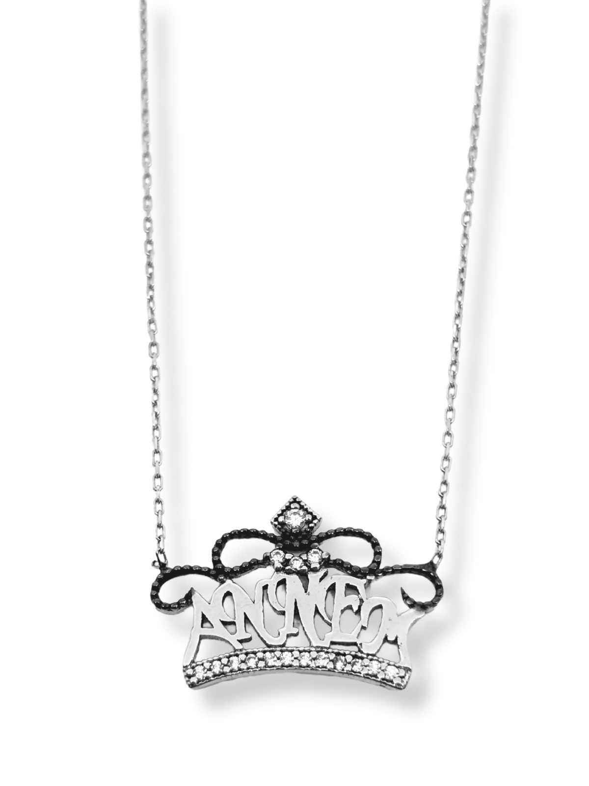 Siyah&Beyaz Işıltılı Annem Yazılı Kraliçe Tacı Gümüş Hayalet Kolye