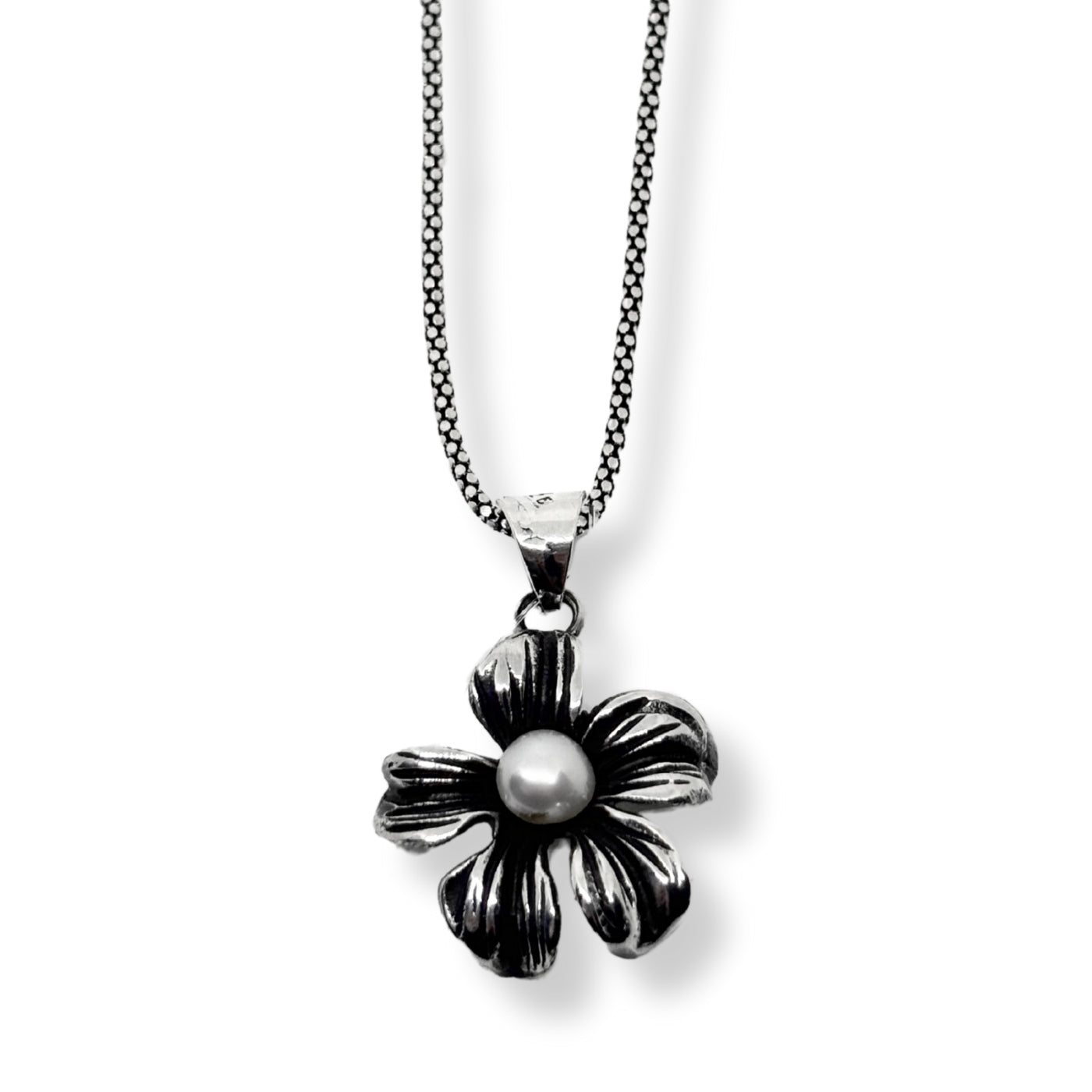 Authentic İnci Işıltılı Çiçek Gümüş Kadın Kolye