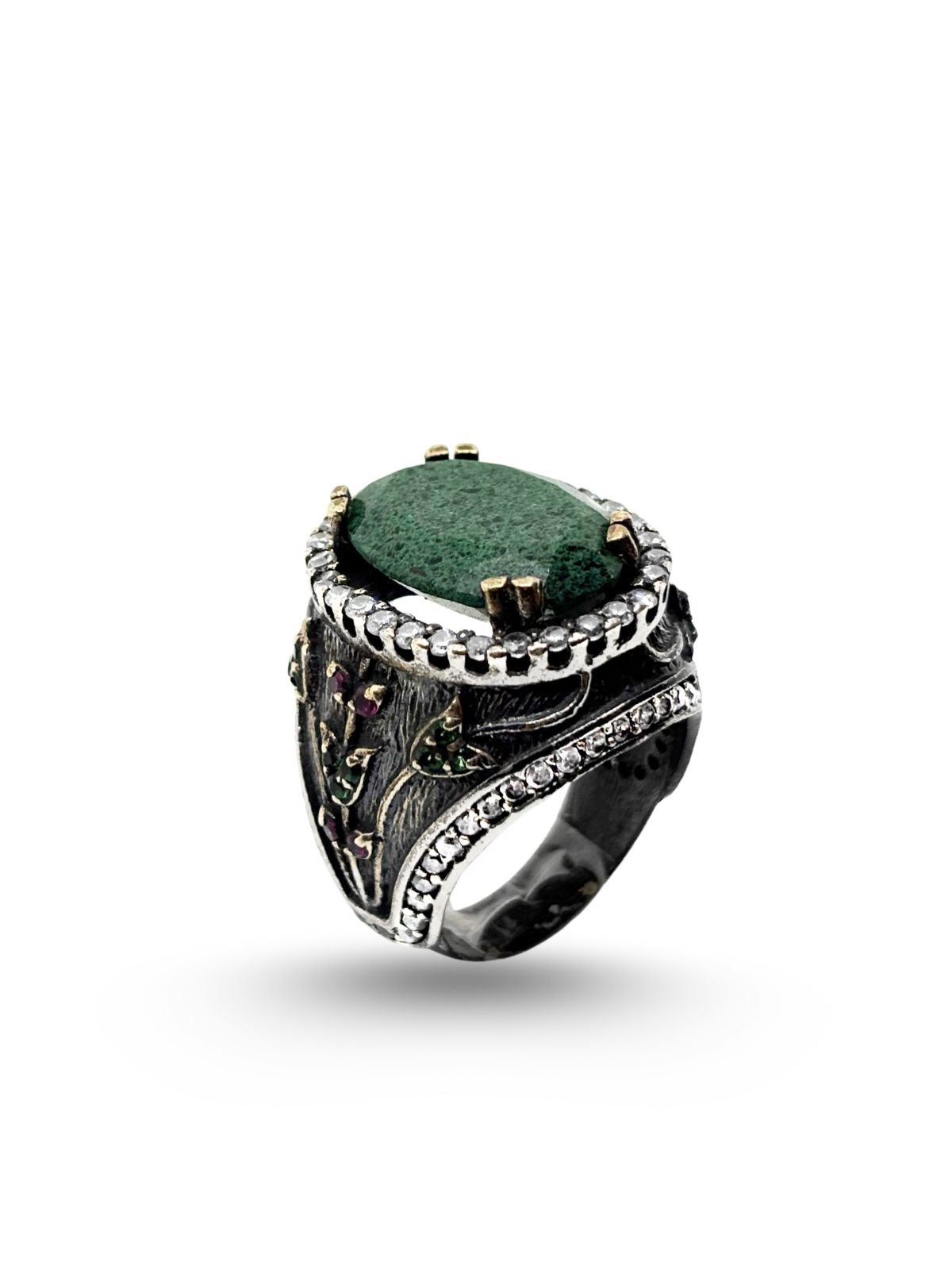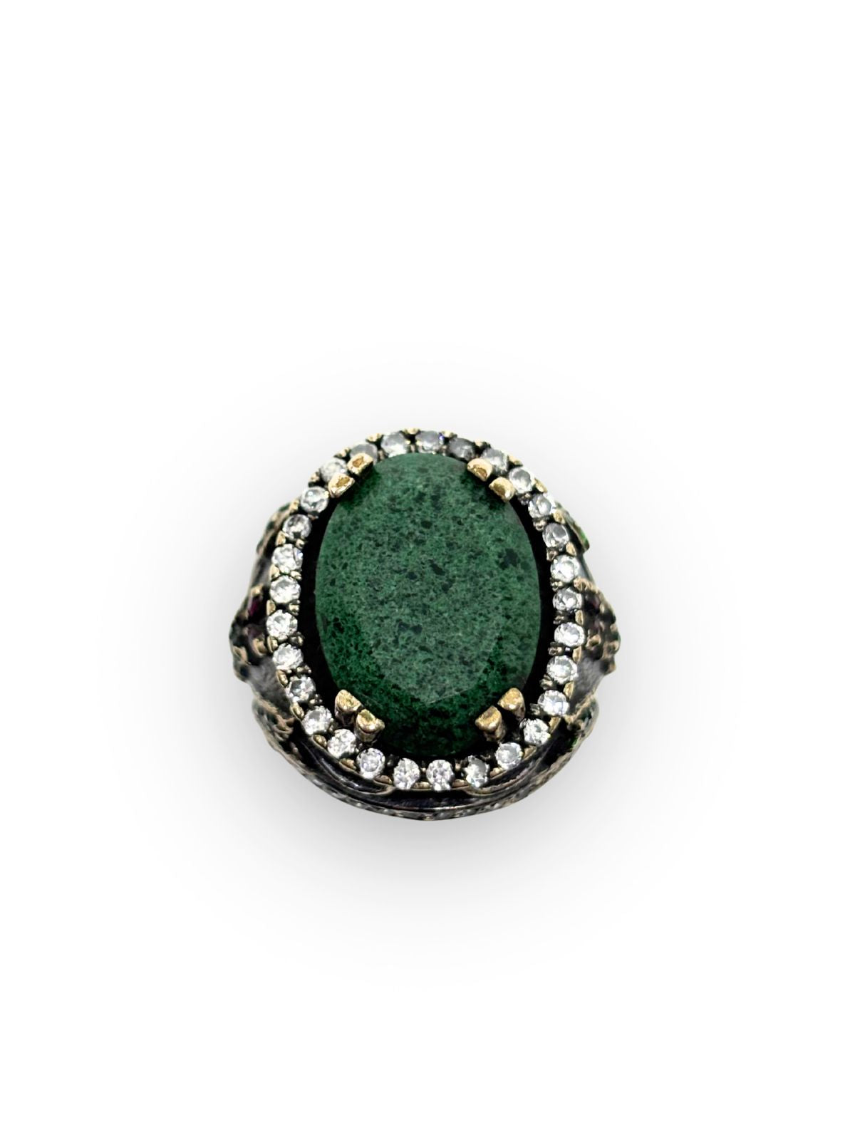 Işıltı Çevrili Kök Zümrüt Otantik Gümüş Kadın Yüzük
