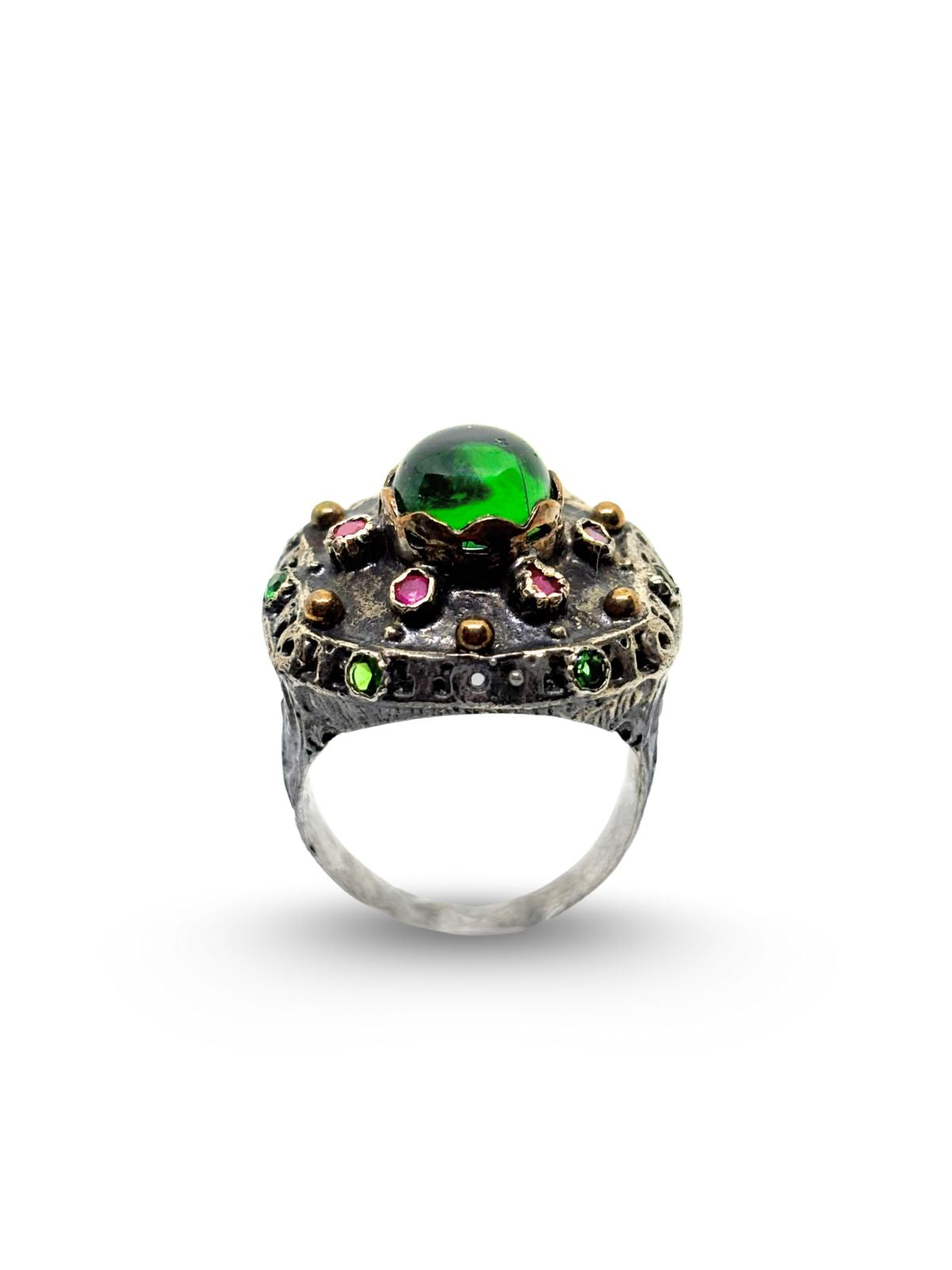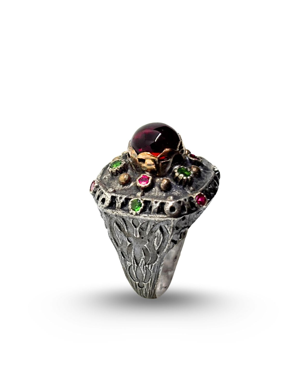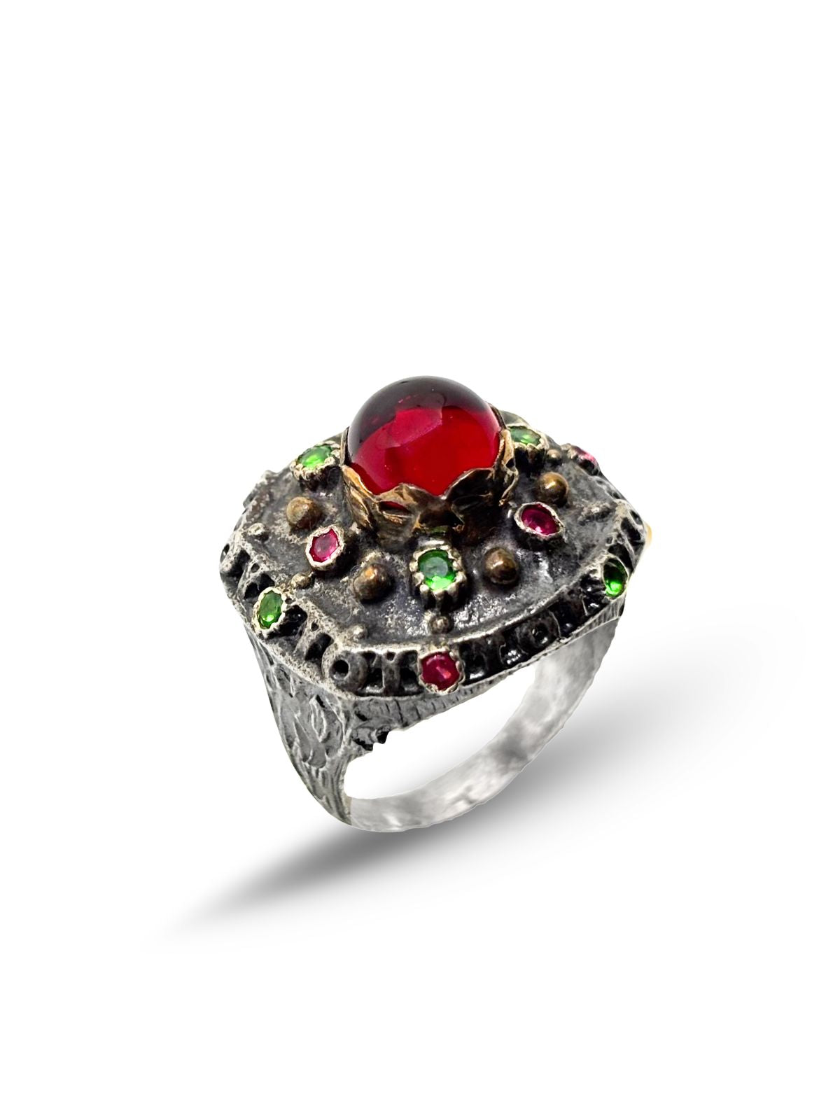 Yüzüğün merkezinde yer alan yuvarlak kesim yakut taşı, çevresini saran zümrüt taşları ile eşsiz bir kontrast oluşturur. Yakutun derin kırmızısı tutkuyu simgelerken, zümrüdün canlı yeşili doğanın zarafetini yansıtır. Gümüş üzerine işlenmiş ince detaylar, el işçiliğinin kalitesini vurgular ve yüzüğe klasik bir asalet kazandırır.