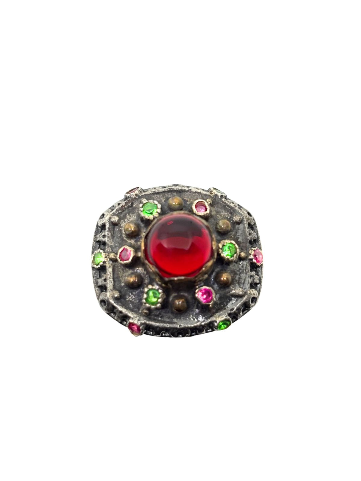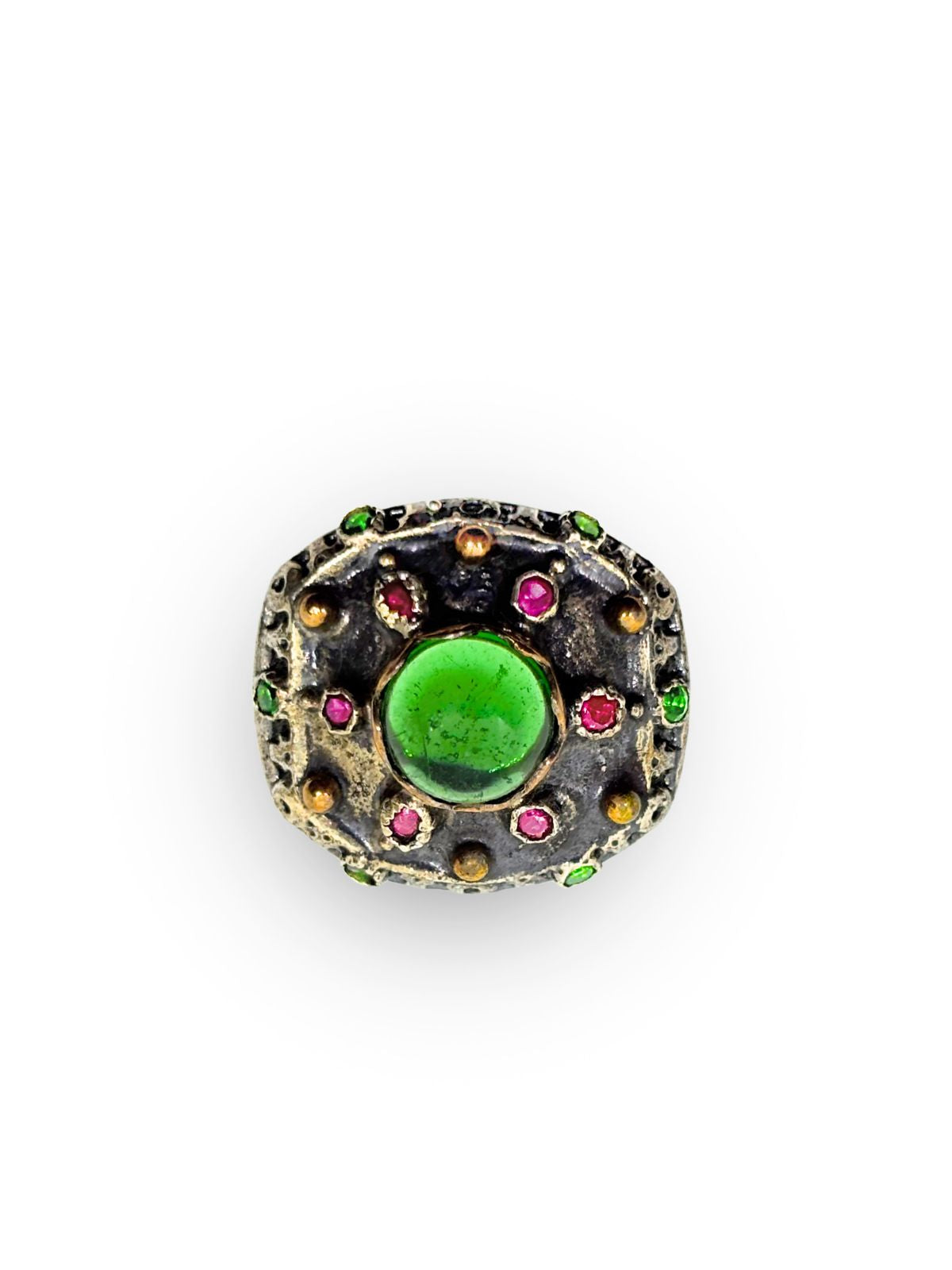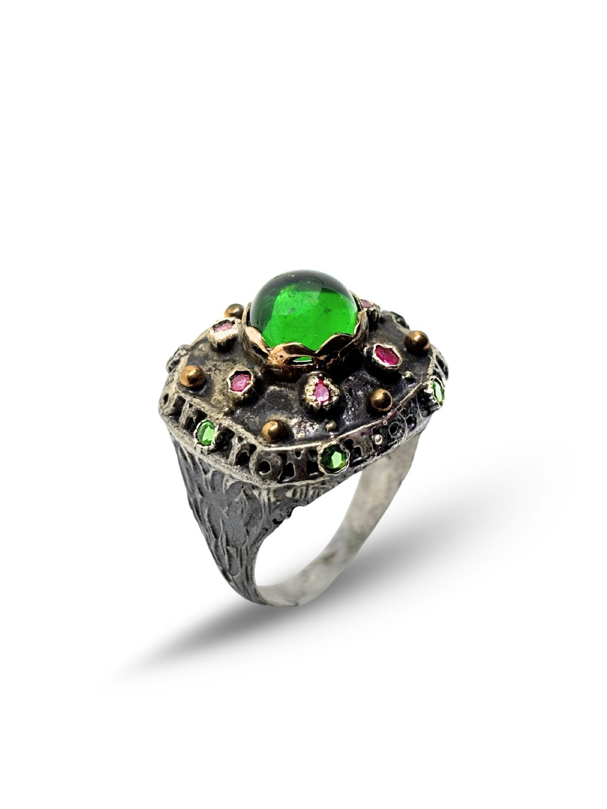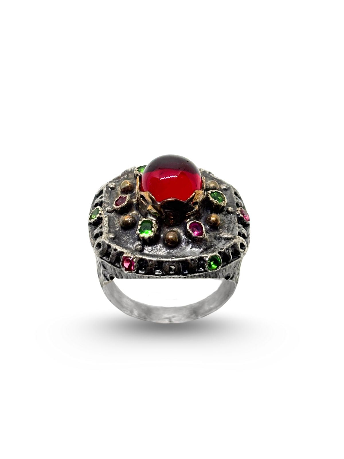 Yüzüğün merkezinde yer alan yuvarlak kesim yakut taşı, çevresini saran zümrüt taşları ile eşsiz bir kontrast oluşturur. Yakutun derin kırmızısı tutkuyu simgelerken, zümrüdün canlı yeşili doğanın zarafetini yansıtır. Gümüş üzerine işlenmiş ince detaylar, el işçiliğinin kalitesini vurgular ve yüzüğe klasik bir asalet kazandırır.