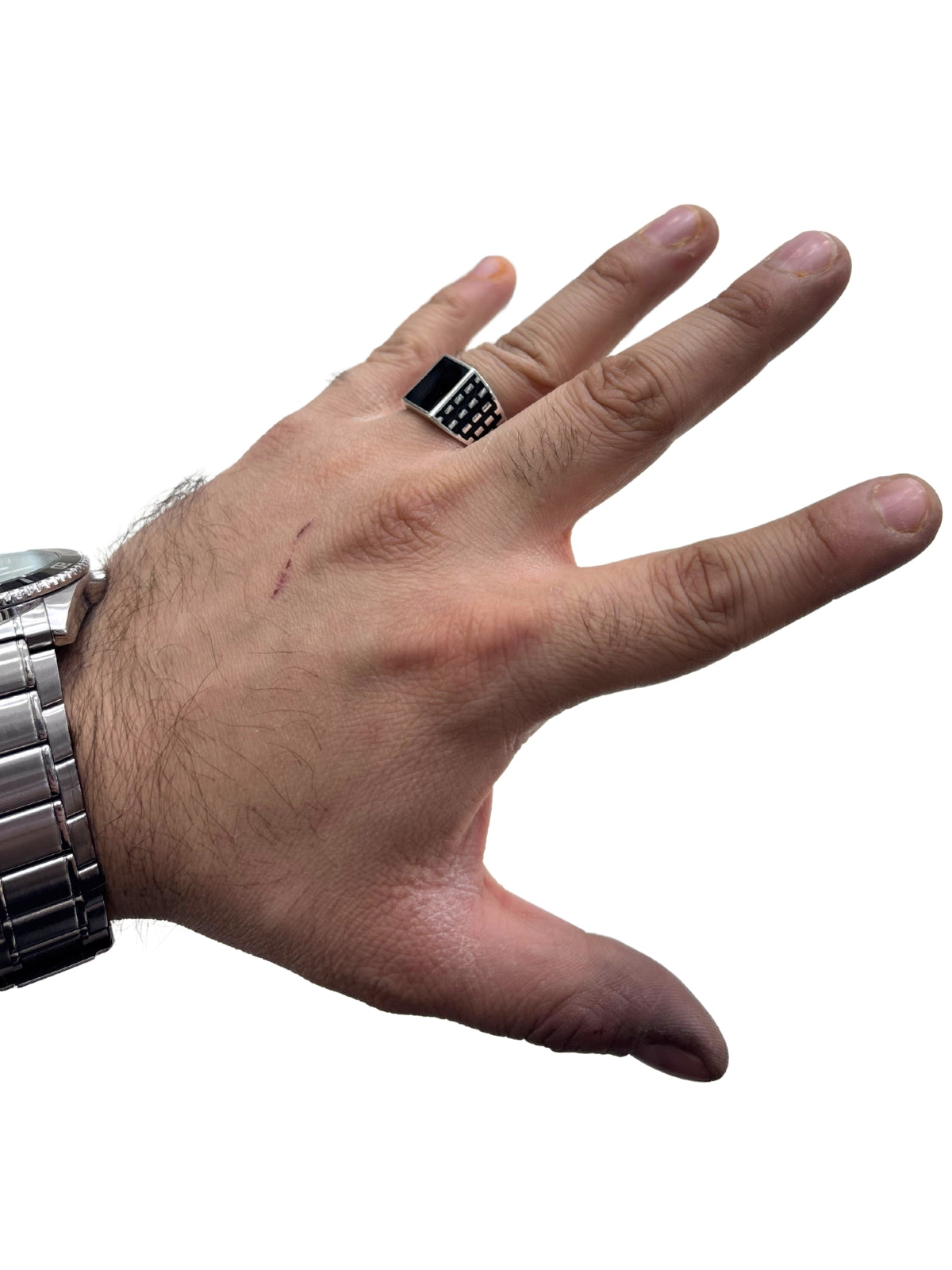 Gümüş ve siyah minenin kontrastı ile öne çıkan bu yüzük, keskin hatları ve maskülen duruşuyla modern stilini vurgulamak isteyen erkekler için özel olarak tasarlanmıştır. Hem günlük kullanım hem de özel günler için ideal bir aksesuardır.