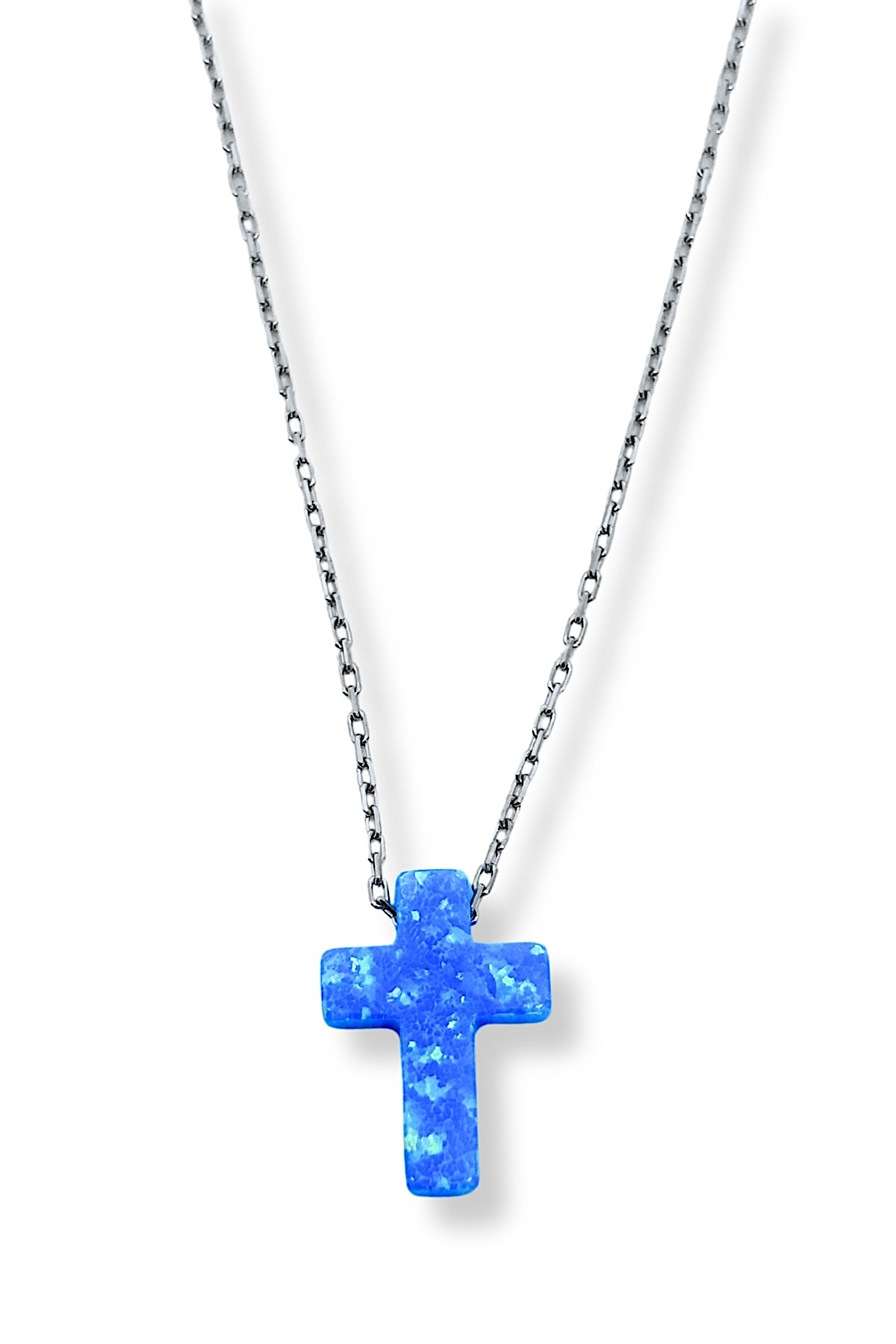 Mini Mavi Opal Işıltılı Haç Gümüş Kadın Kolye