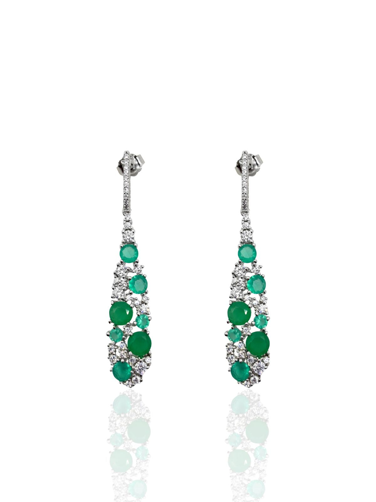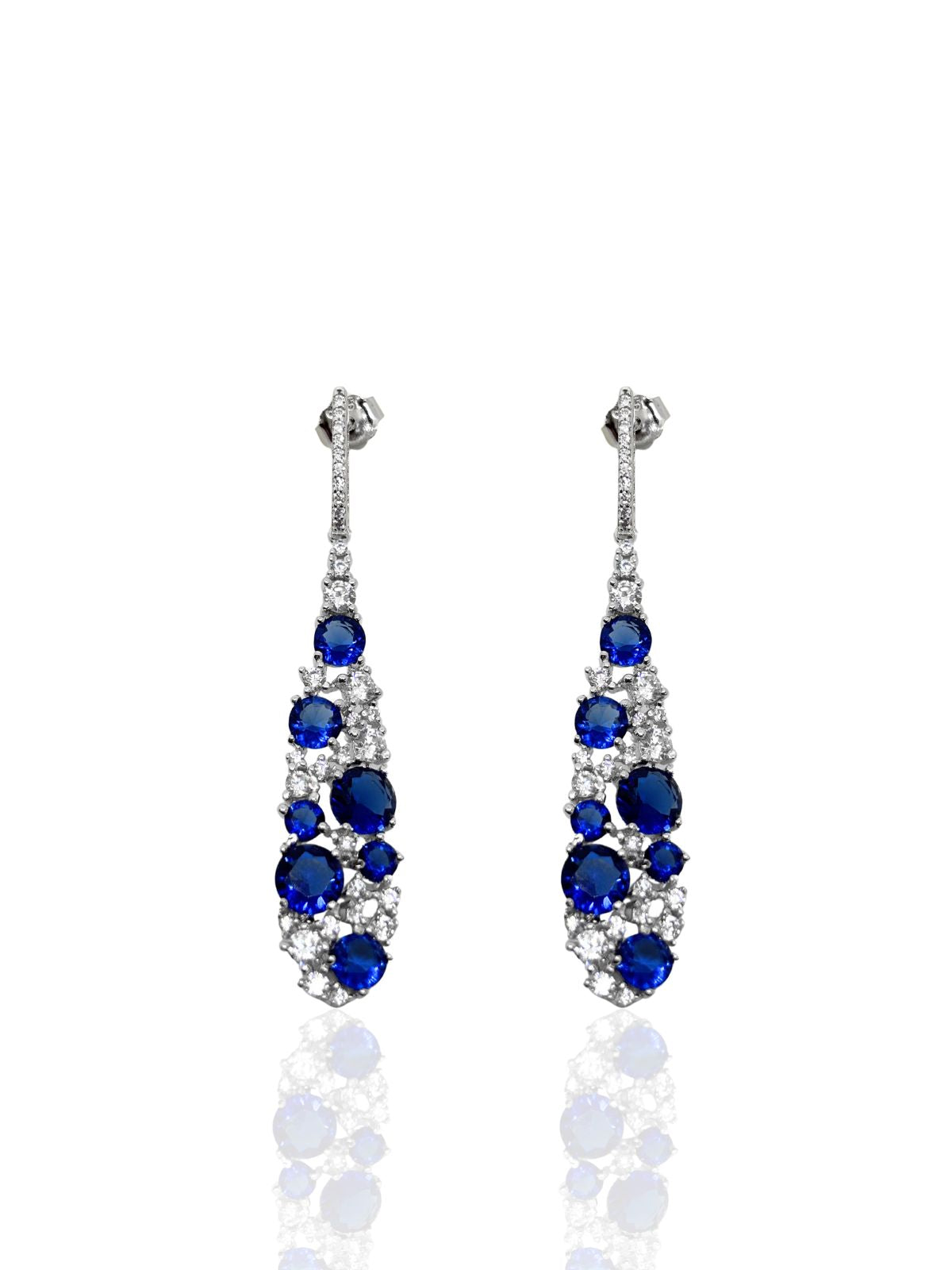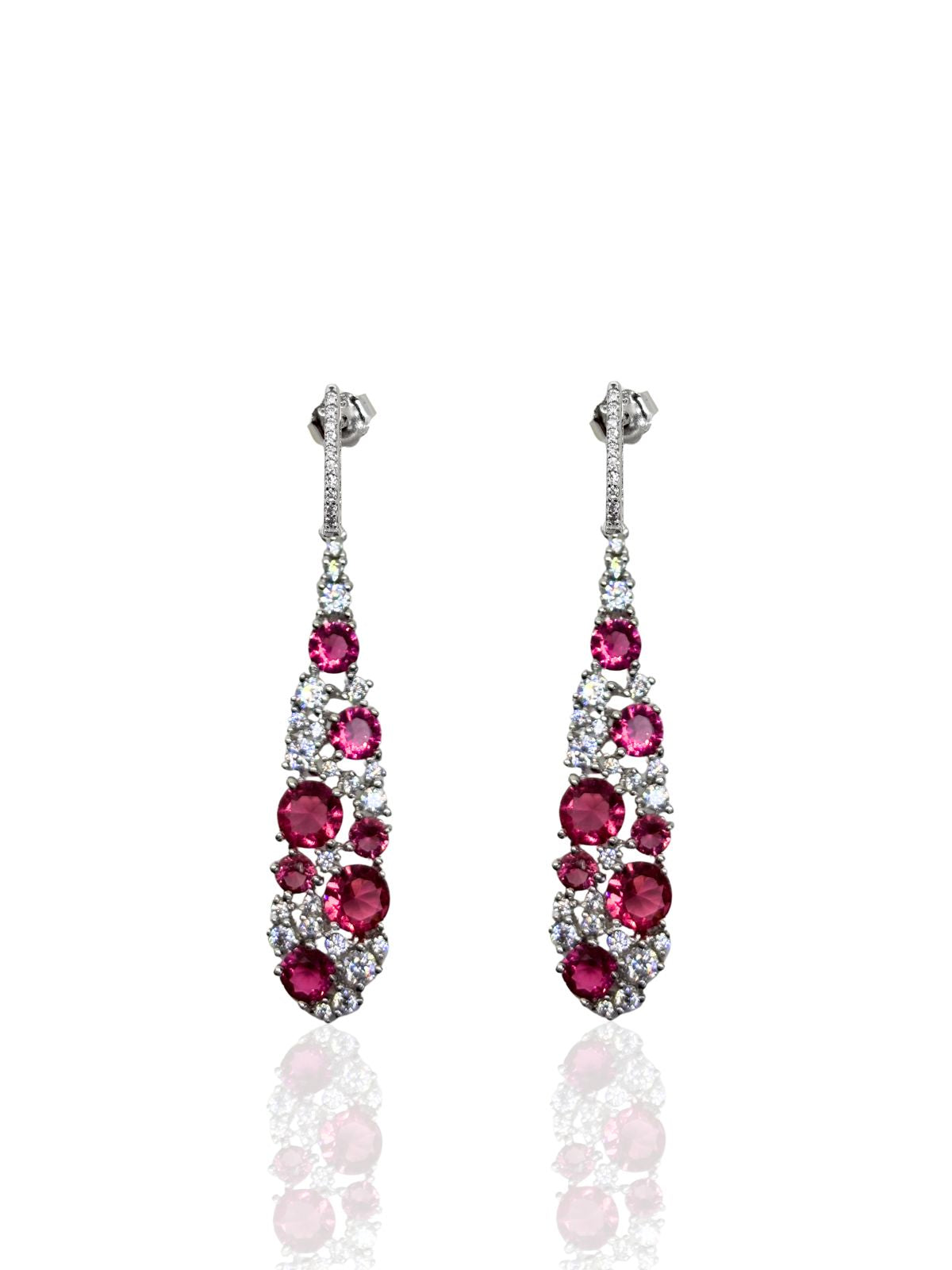 Beyaz Işıltılı Uzun Damla Form Safir&Zümrüt&Yakut Vidalı Gümüş Küpe 4.9x0.9cm